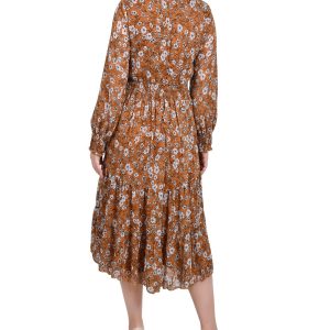 Petite Long Sleeve Clip Dot Chiffon Dress With Smocked Waist