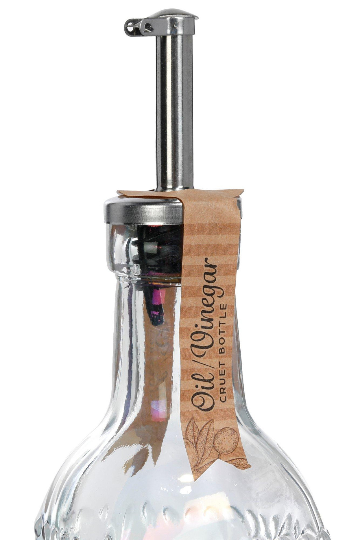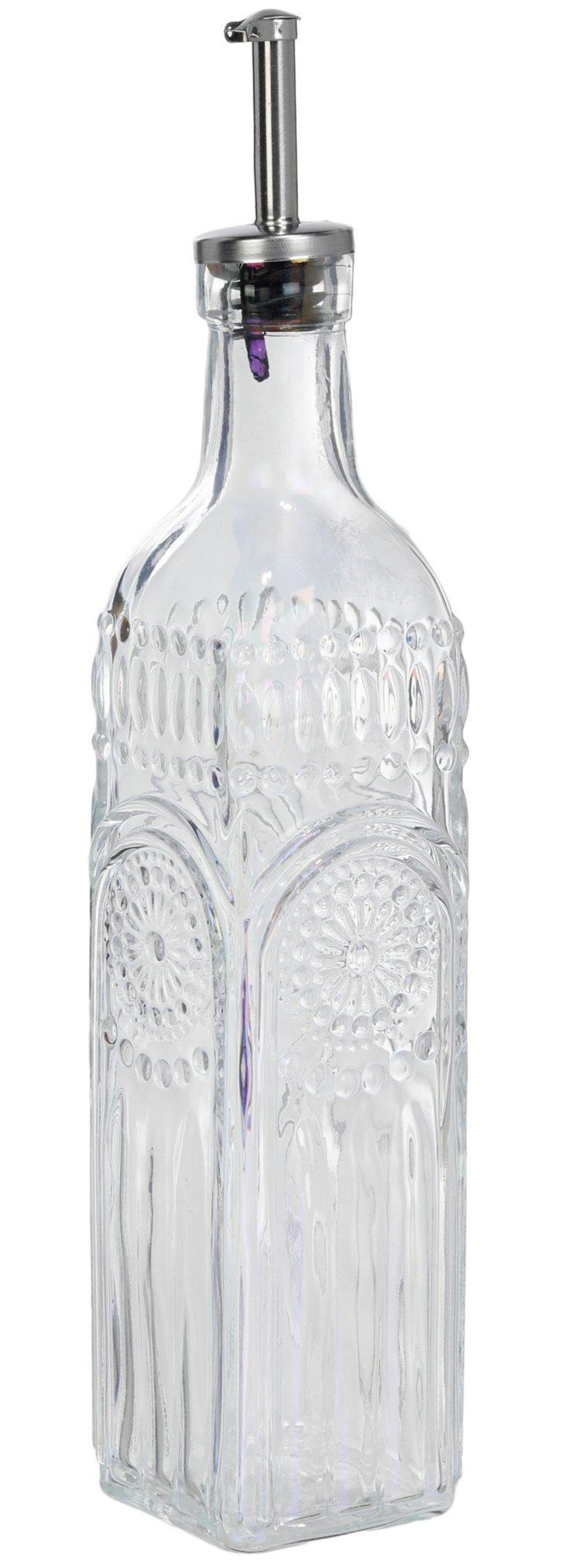 Add style to your kitchen with this Oil & Vinegar Cruet Bottle. Featuring one 16 oz square glass bottles with an elegant cut-glass design, it offers clear visibility and easy pouring. Perfect for olive oil, vinegar, or dressings, this bottle combines function and beauty for everyday use or entertaining. Measures approximately 10 in x 2 in.