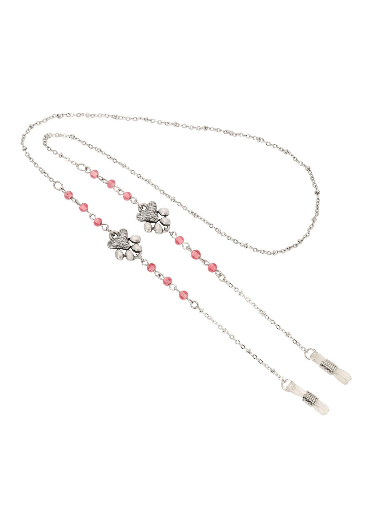 Keep your glasses stylishly within reach with this elegant necklace. Featuring smooth, round rose pink beads adorned with charming dog paws, this chic eyeglasses or sunglasses holder rests gracefully on a silver-tone chain. Avoid stretching your shirts by hanging your glasses from this fashionable accessory, ensuring both convenience and style in one beautiful piece. Length 26 in., width 6 mm.