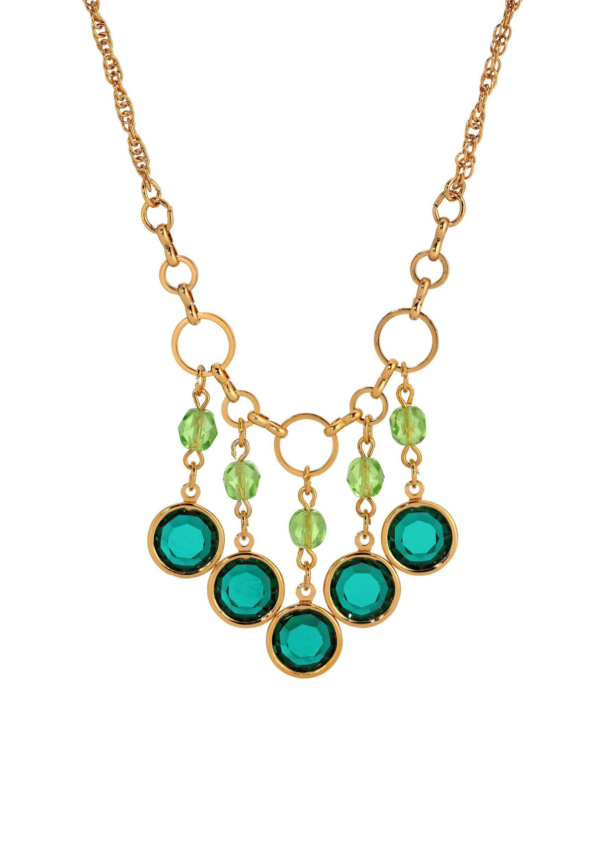 Elevate your collection with this 1928 Jewelry Gold Tone Green Crystal Necklace. A cascade of faceted green crystals glimmers against a rich gold-tone setting, evoking vintage sophistication. The bib silhouette offers graceful movement and refined color, making it a striking statement for the discerning jewelry connoisseur. Length 16 in., width 40mm.