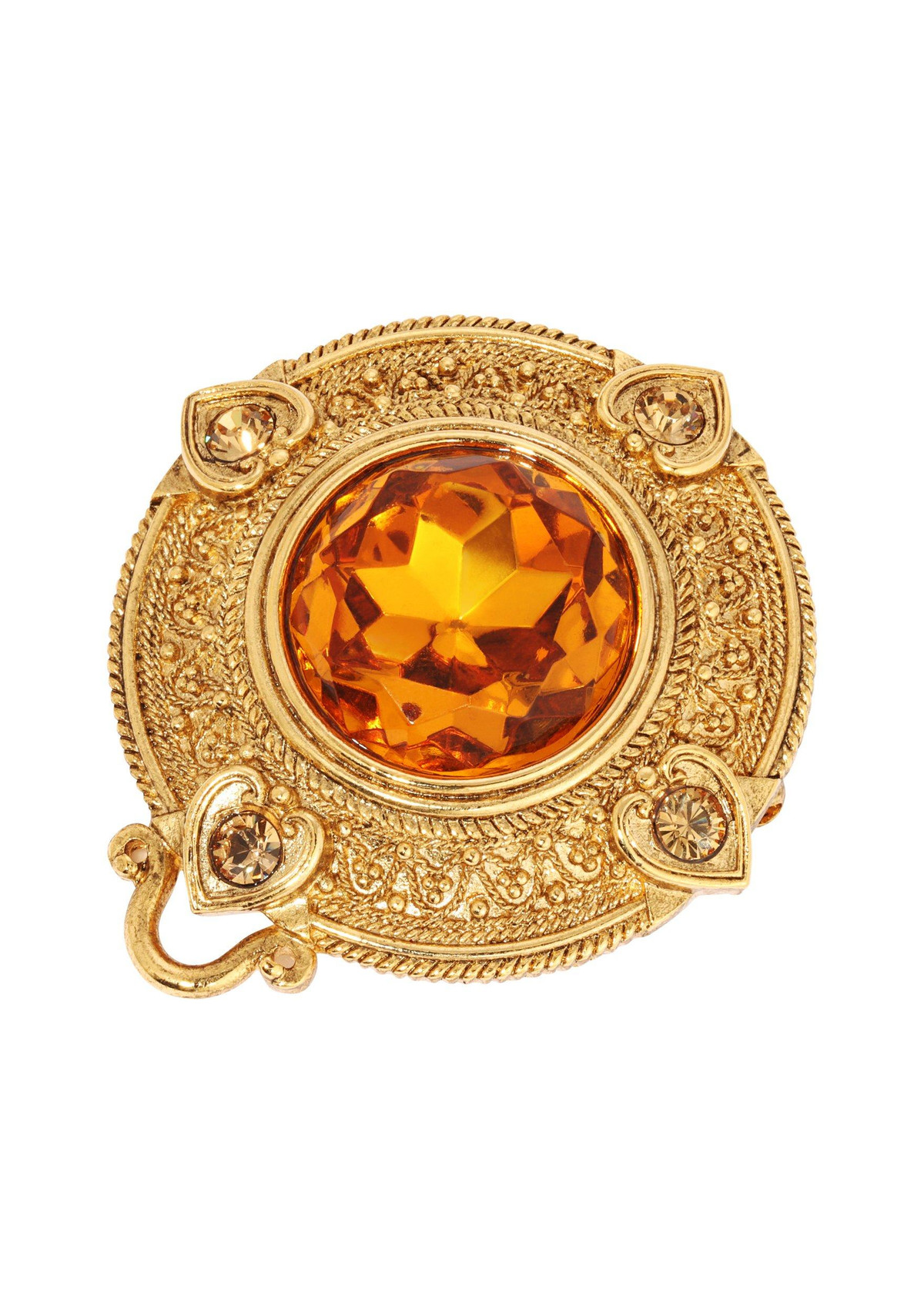 This exquisitely designed circular brooch showcases intricate heart patterns encircling its perimeter, each embellished with glimmering topaz crystals, adding a hint of sophistication. At its focal point sits a captivating large round topaz crystal, commanding attention. Length 1.95 in., width 44mm.