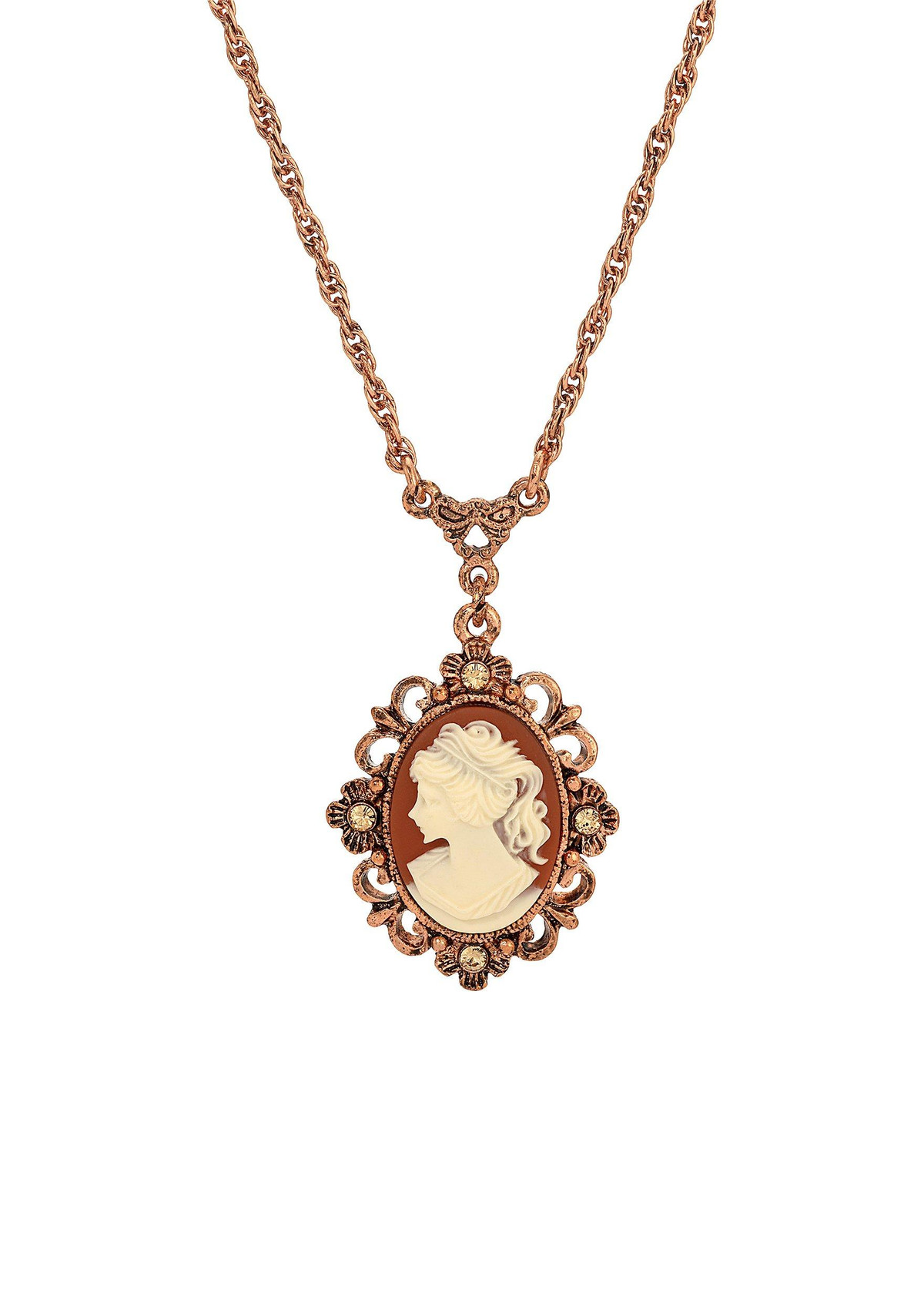 Add timeless elegance with the 1928 Jewelry Oval Cameo Crystal Necklace. This vintage-style carnelian cameo pendant is framed with intricate gold-tone detailing and accented with sparkling topaz-colored crystals. The adjustable chain ensures a perfect fit, making it a delicate and graceful piece for both everyday wear and special occasions. Length 15 in., width 22mm.
