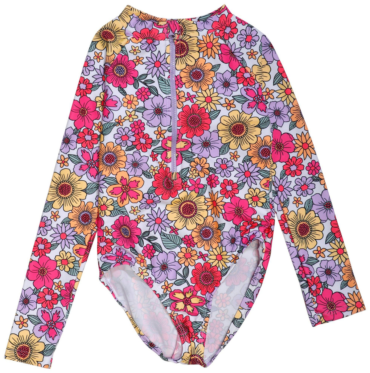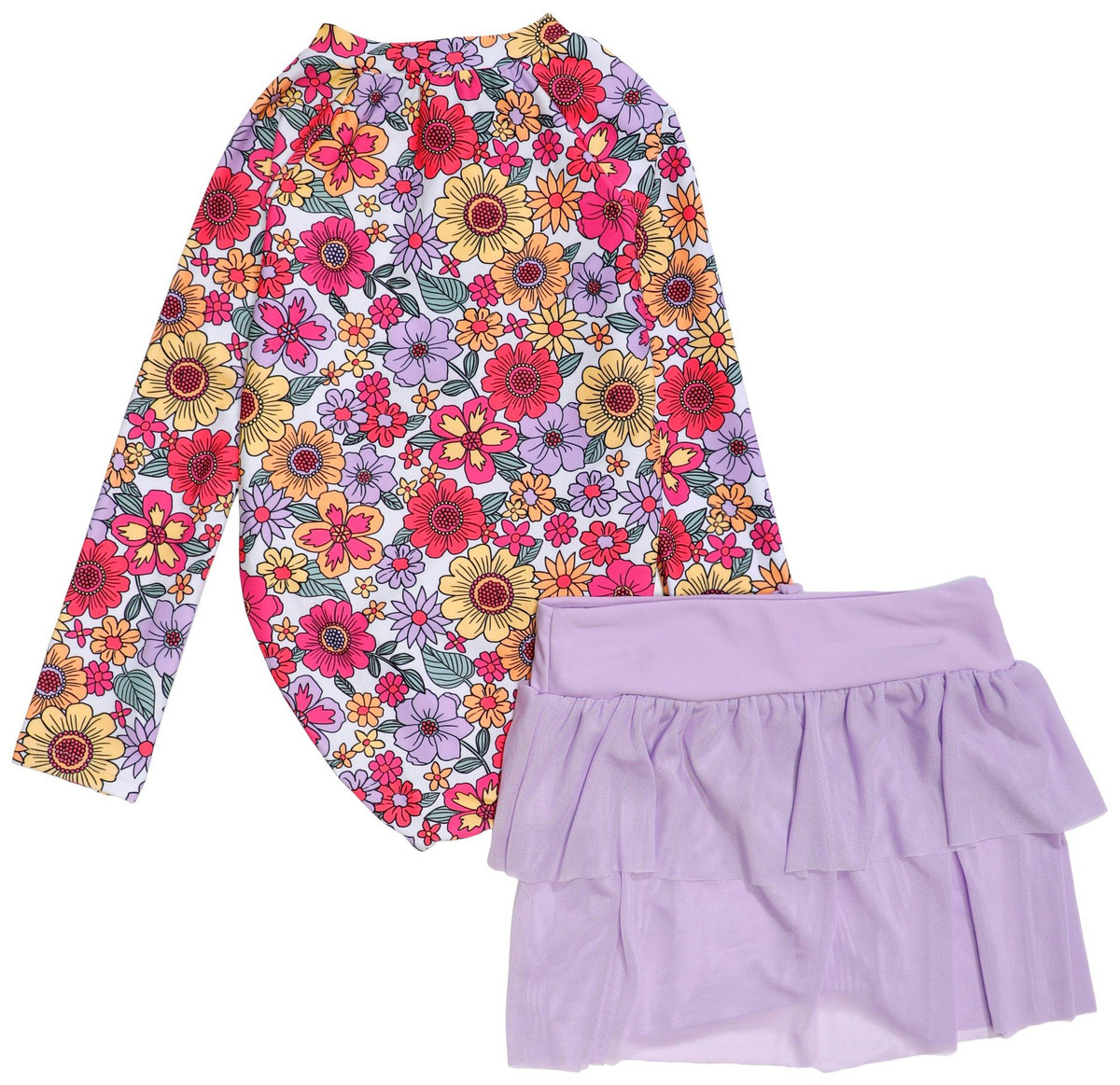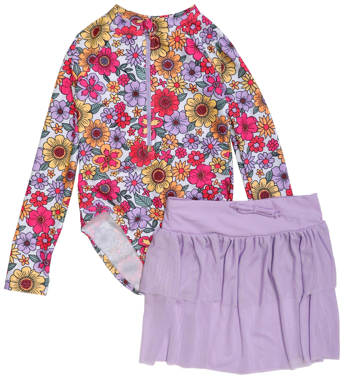 This Btween 2-piece set features a floral print one-piece rash guard with a tiered skirt for a stylish and playful look. Made from a spandex and polyester blend, it offers breathability, stretch, and all-day comfort. Perfect for swimming and sun protection, this set combines fashion and function, making it a great choice for active little girls!