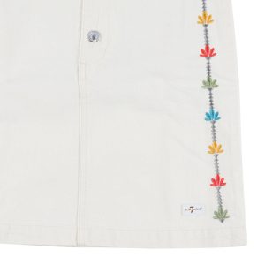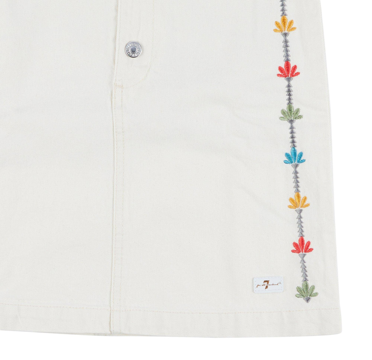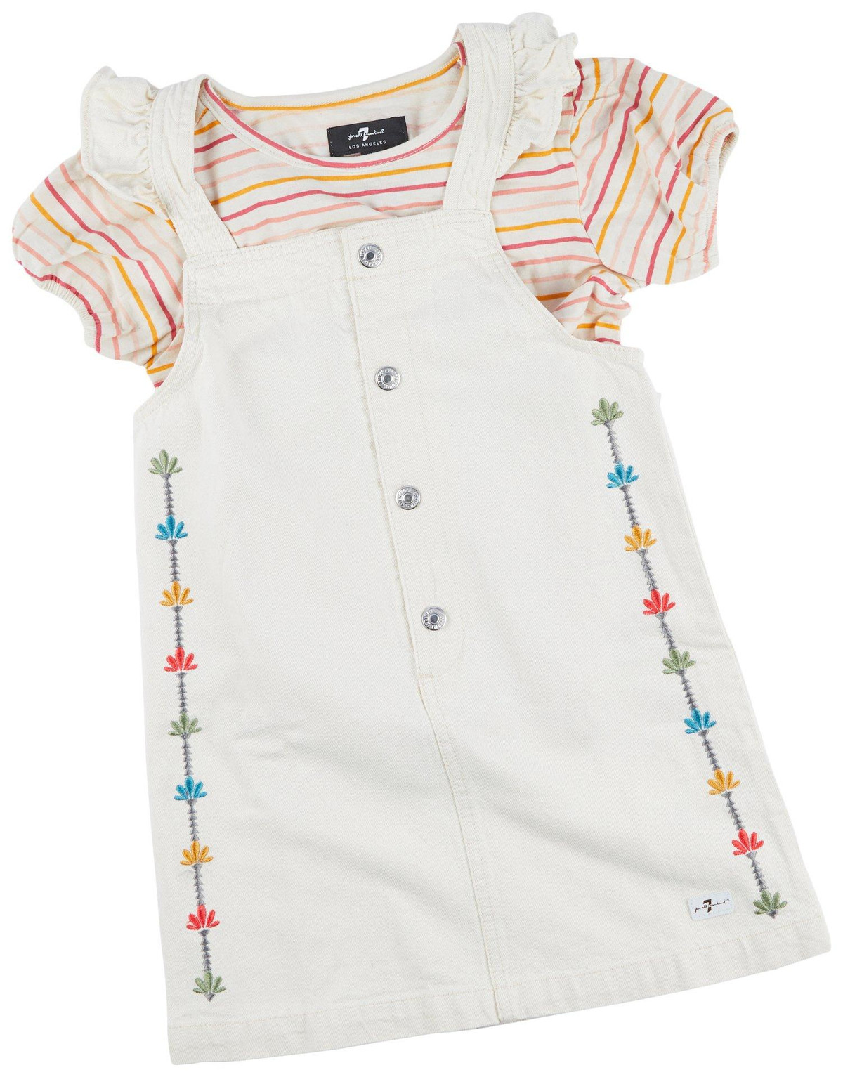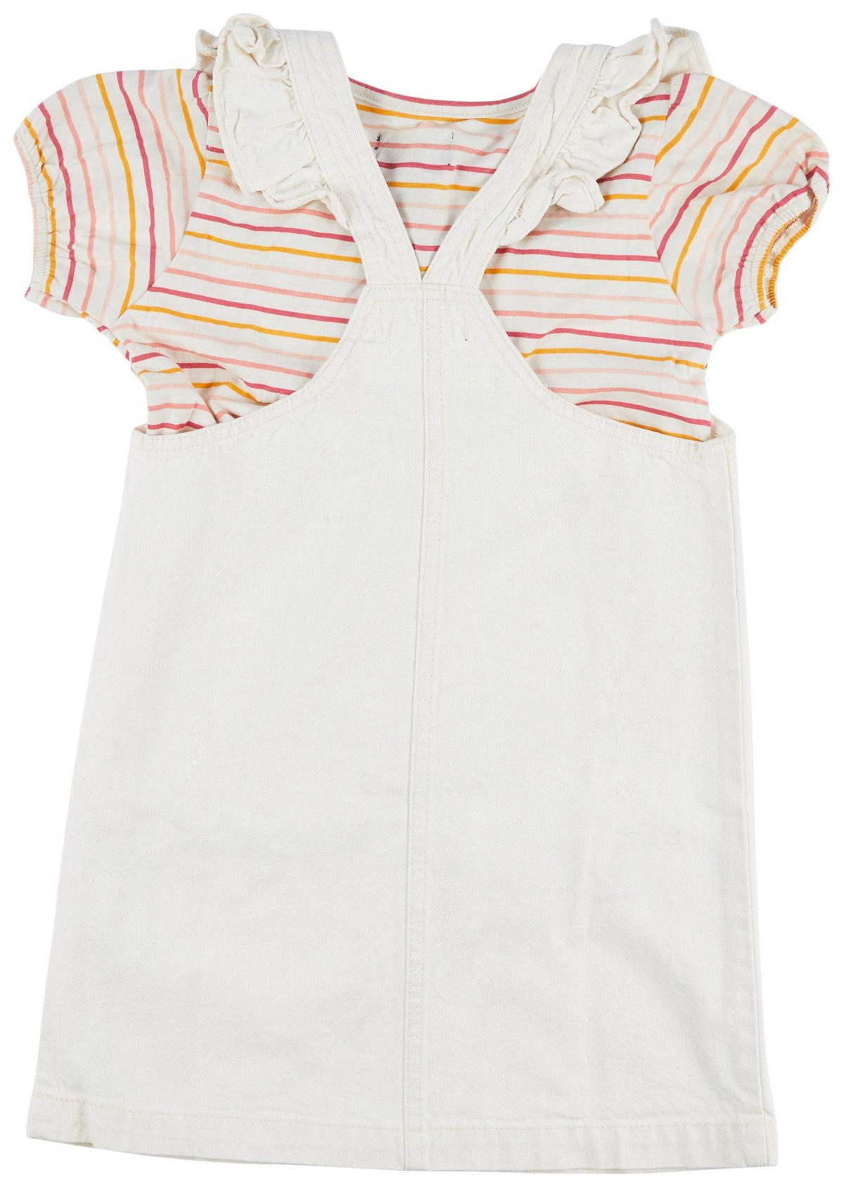 Add a pop of color to her wardrobe with this charming set. Featuring a white denim overall dress with floral embroidery and a striped ruffle-sleeve tee, its the perfect mix of playful and polished.