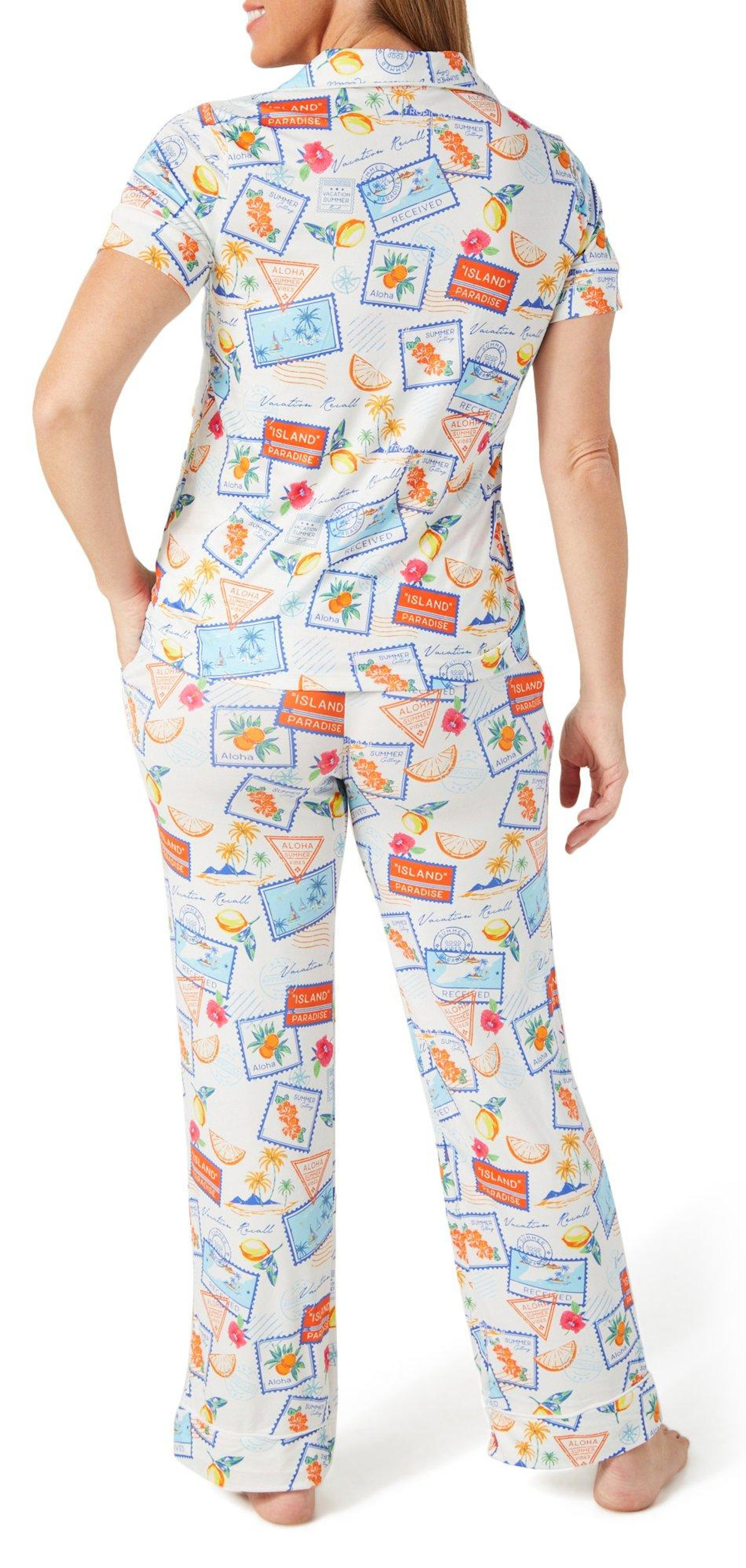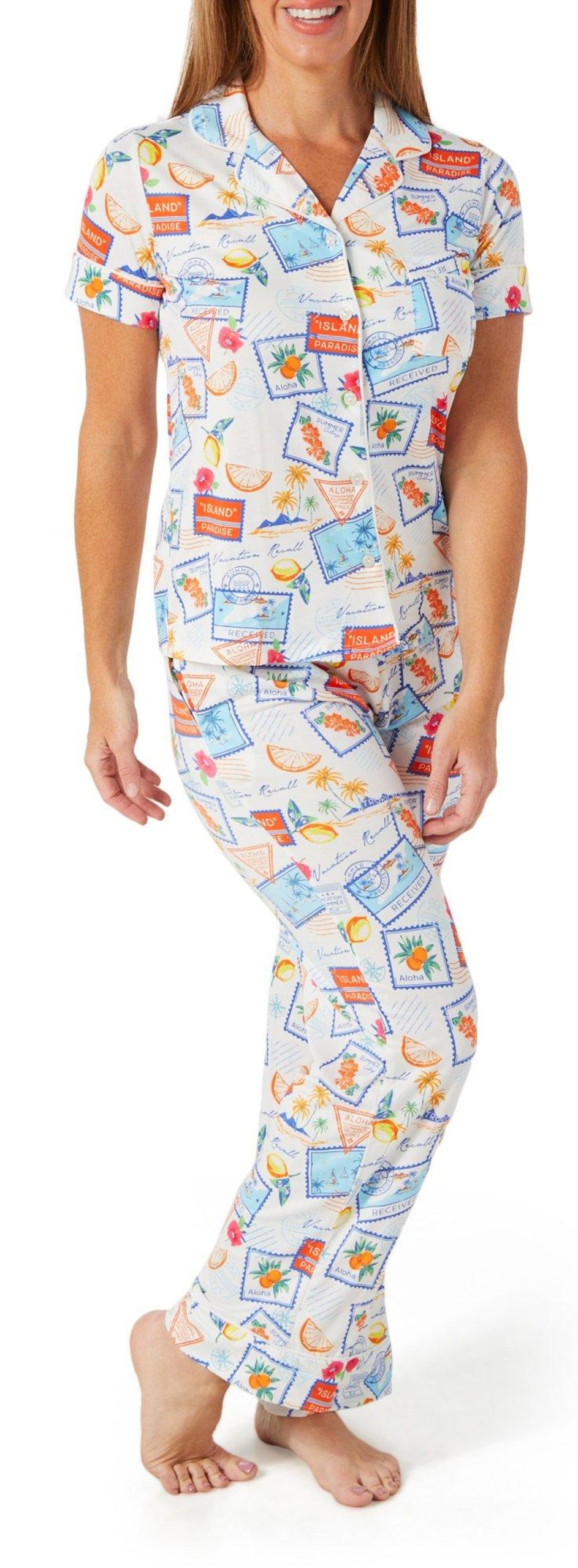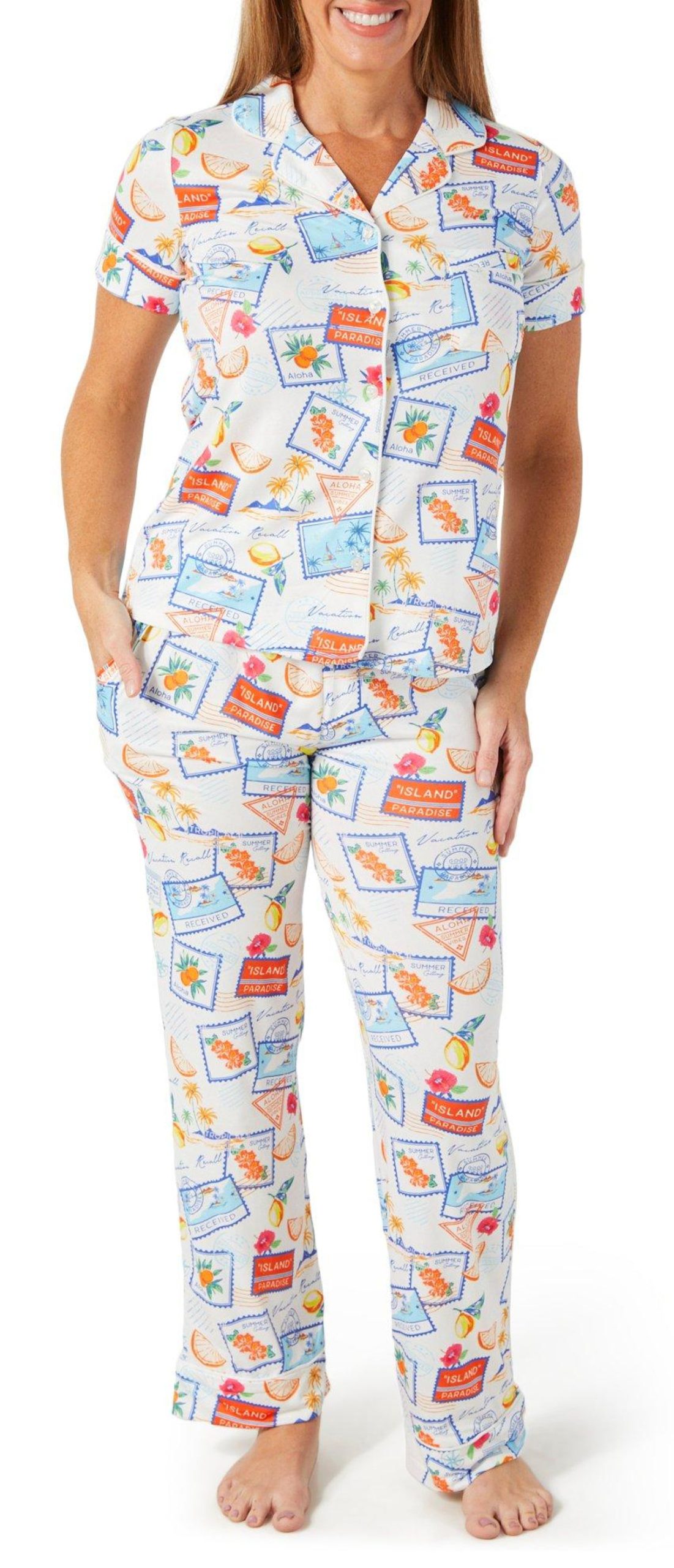 This women’s 2 piece travel stamp sleepwear set features a button down short sleeve top and matching pants with an all over travel stamp graphic. Designed for comfort and charm, it brings a playful wanderlust vibe to your nighttime routine. Fabrication 95% polyester, 5% spandex