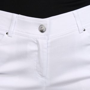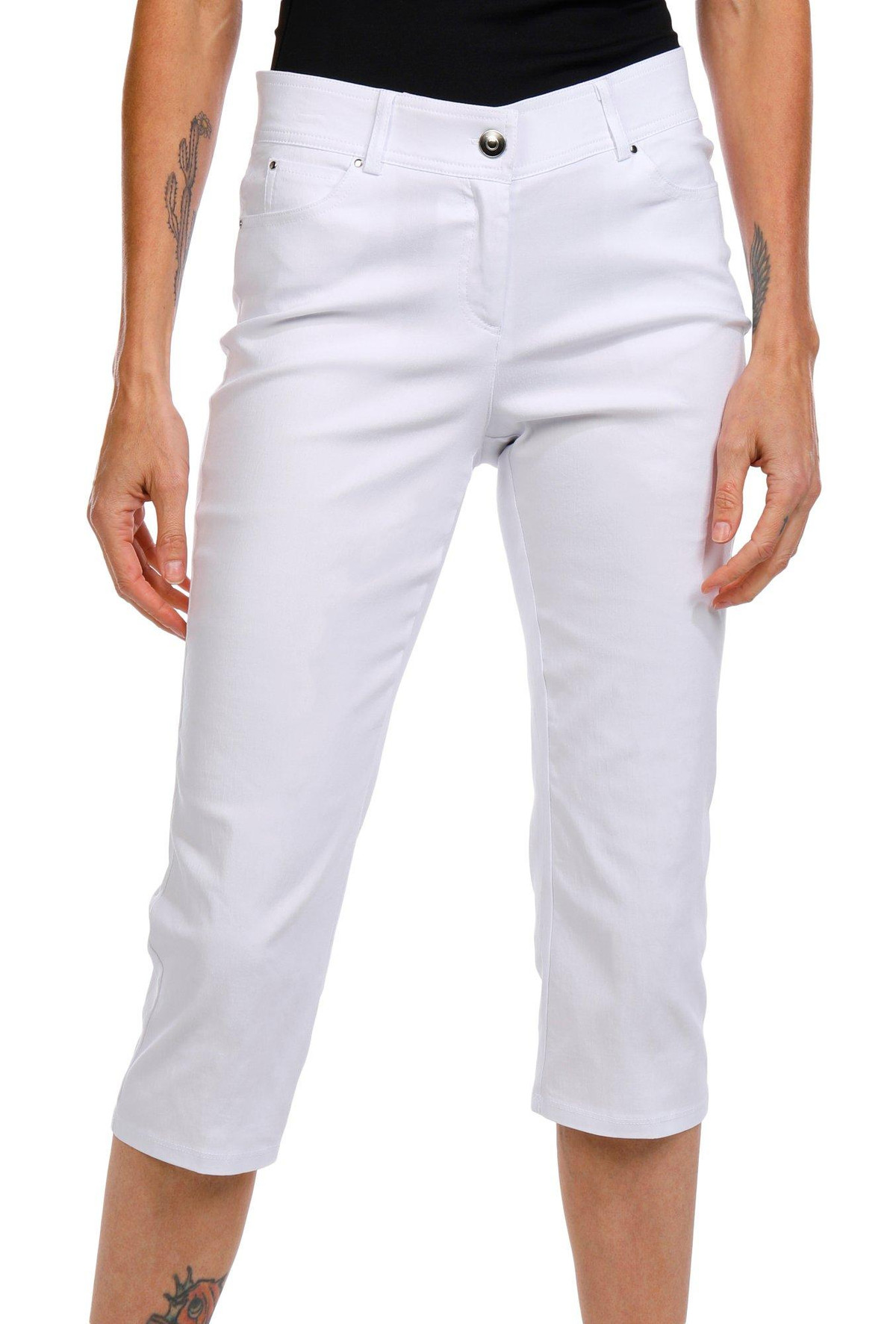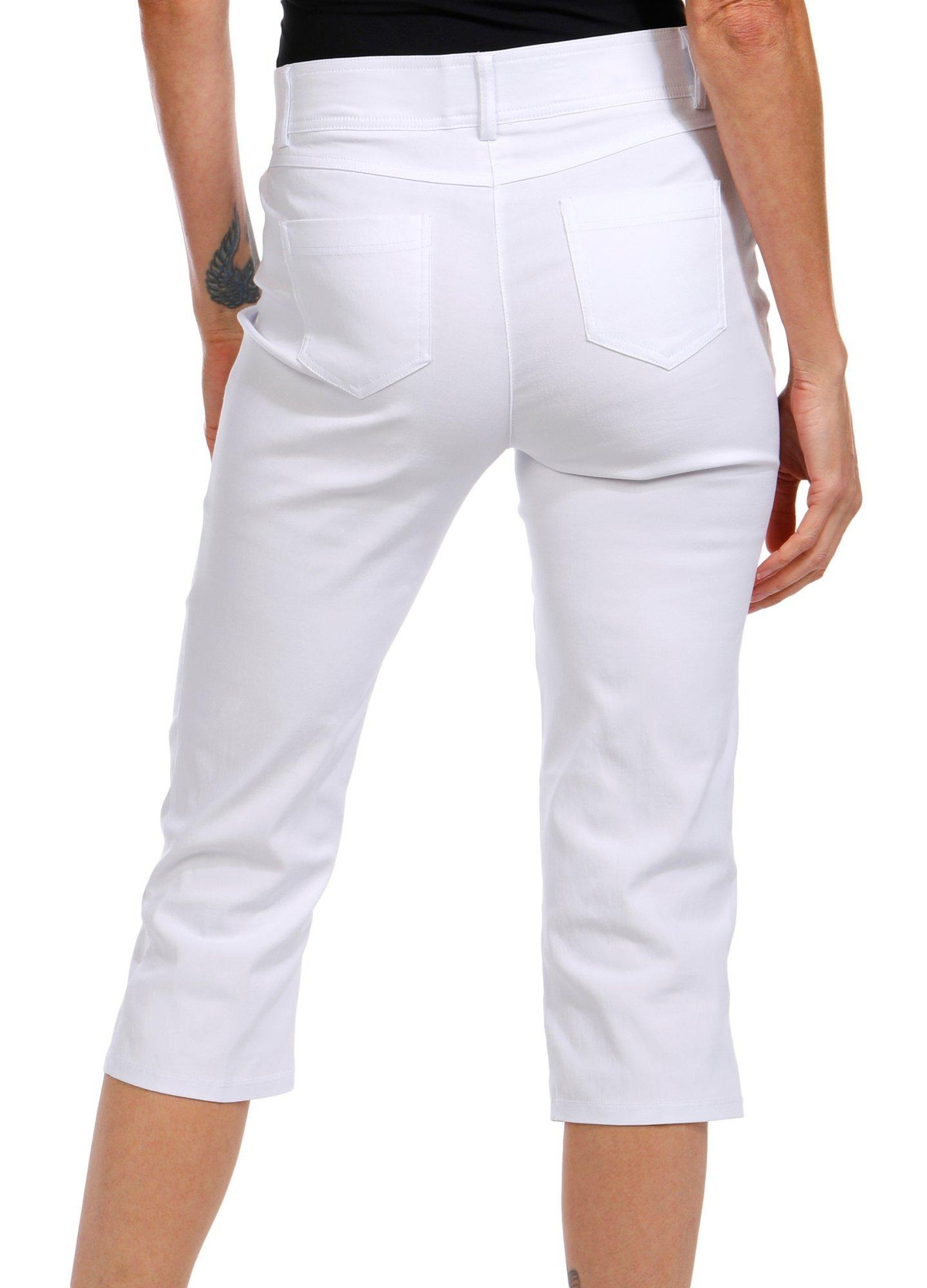 These capris feature a solid color design with double front and back pockets and a comfort waist for all day ease. Stylish and versatile theyre perfect for casual days and laid back outings. Inseam measures approximately 21 in. Fabrication is 76% rayon, 21% nylon, 3% spandex.