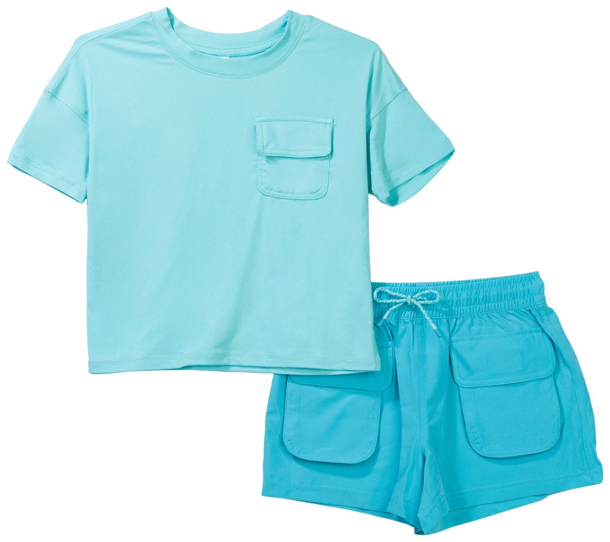 The Big Girls Active 2 Pc Shorts Set is a sporty and stylish choice for active days. It features a short sleeve pocket tee for breathable comfort and pull on shorts with front flap pockets and a drawstring waistband, blending function with everyday ease.