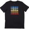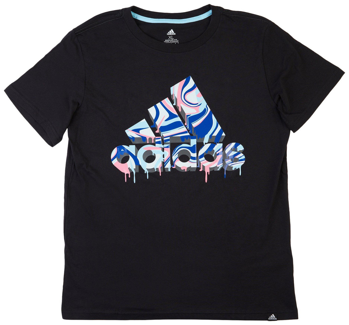 This black Adidas boys’ shirt features a bold logo on the front with a dripping paint design for a trendy, artistic look. Designed with a crew neckline and short sleeves, it offers a classic fit and is made from 100% cotton for softness and breathability. Perfect for everyday wear, this stylish tee combines comfort and standout design, making it a great choice for active kids!