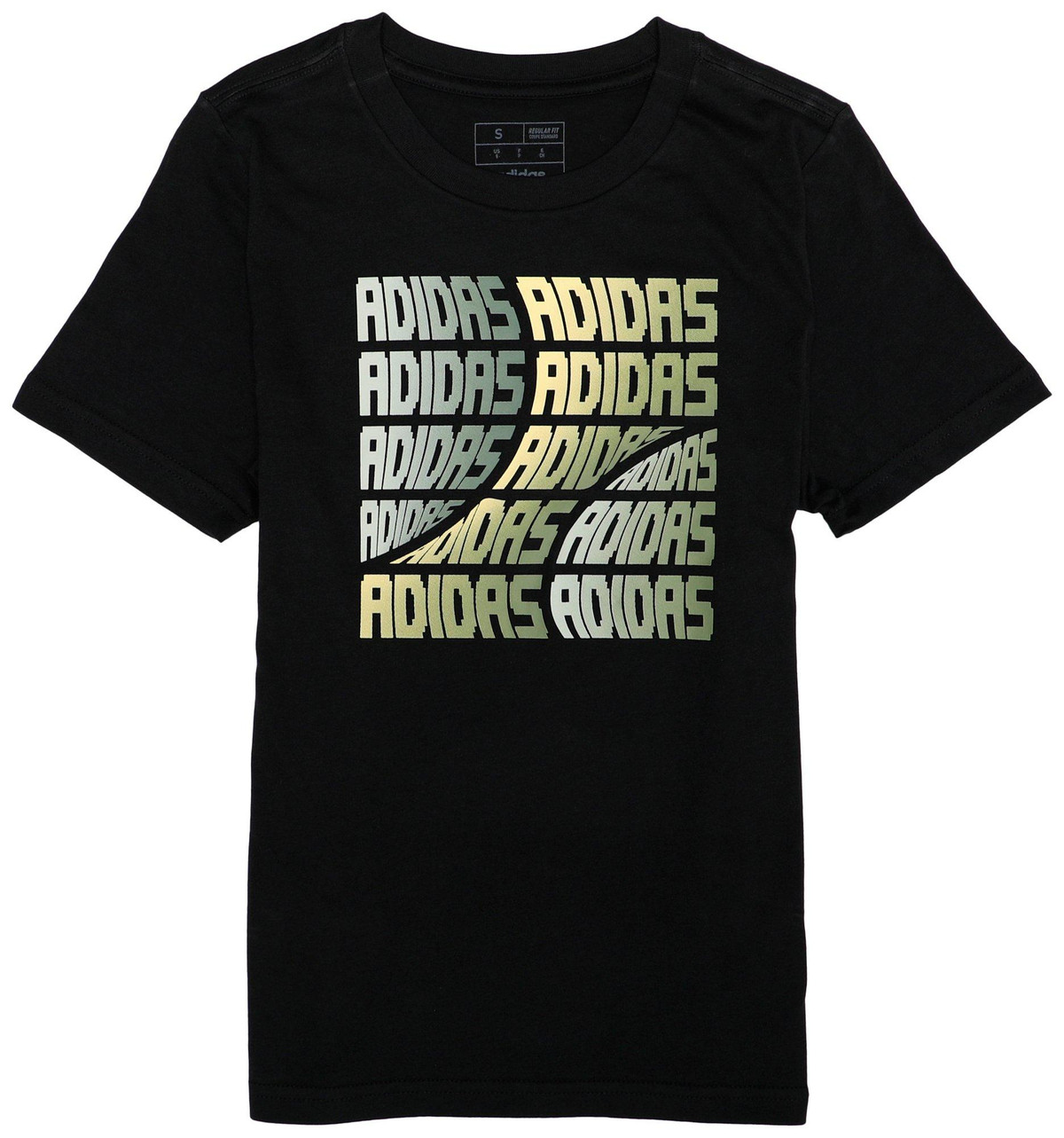 This Adidas T-shirt features a crew neckline and short sleeves for a comfortable, classic fit. Made from 100% cotton, its breathable fabric ensures all-day wearability. The new design showcases a repeat wave logo on the front in a yellow gradient, adding a bold and modern touch. Perfect for casual and sporty looks, this tee is a great choice for style and comfort!