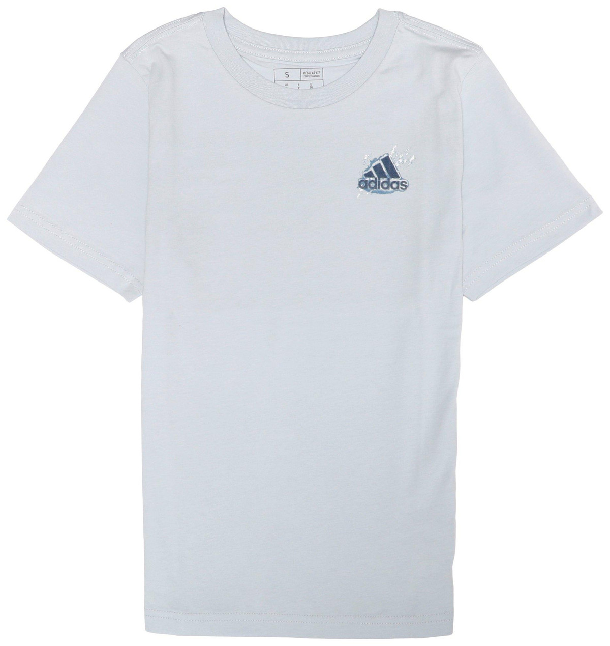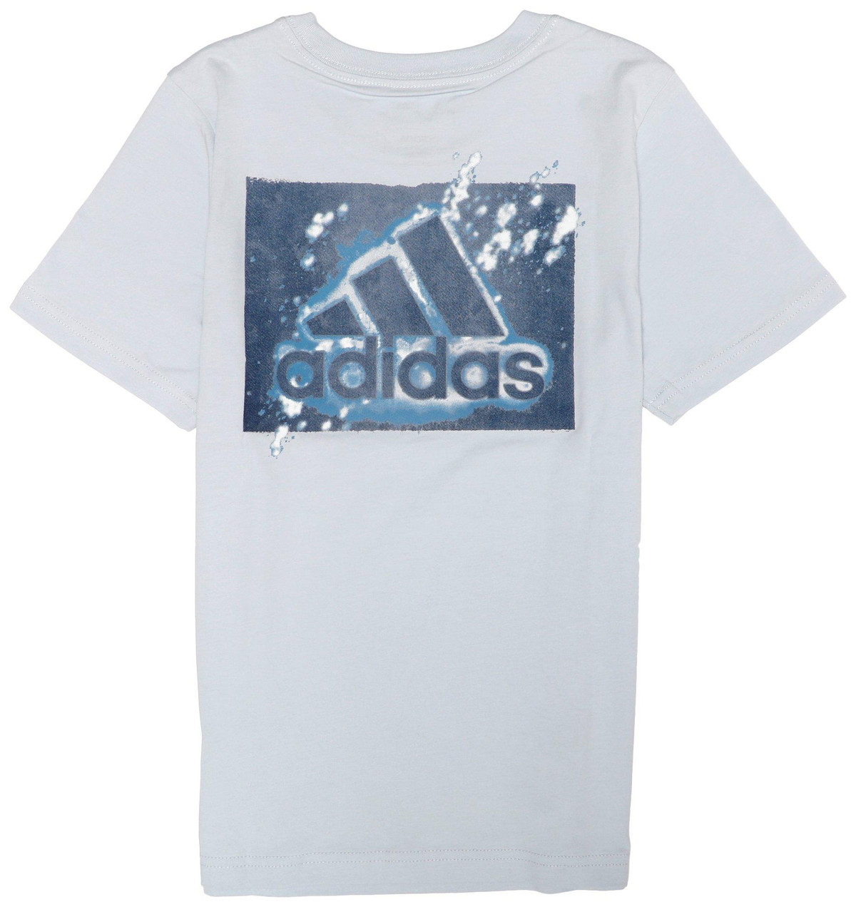This Adidas short-sleeve shirt features a crew neckline and is made from 100% cotton for a soft and breathable feel. The logo on the left chest is complemented by a wash/liquid design, with a large matching graphic on the back for a bold, stylish look. Perfect for casual wear, this shirt combines comfort and modern design, making it a great choice for everyday style!