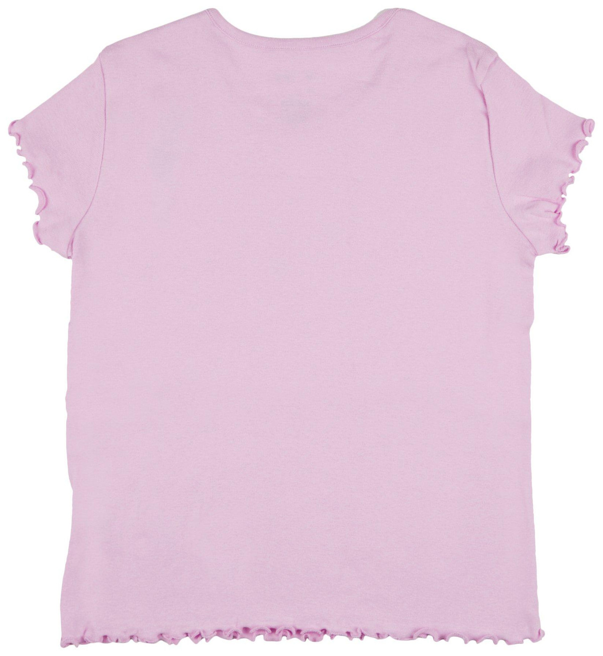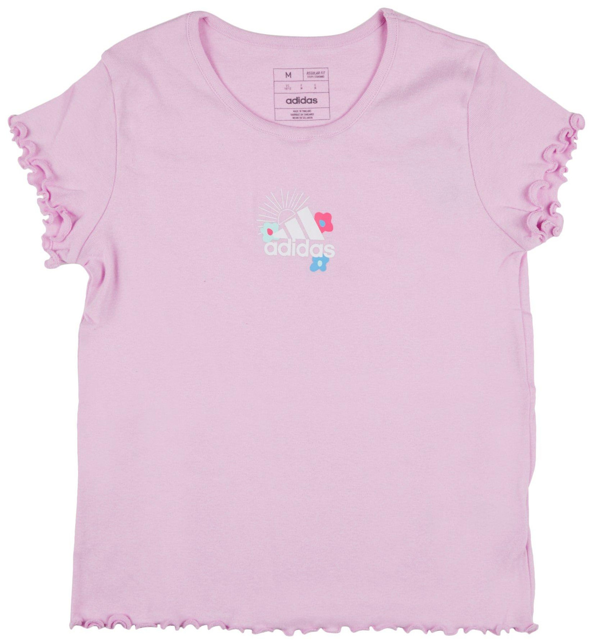 This big girls active tee features a bold chest logo, soft cotton-polyester blend, and playful lettuce edge trim on the sleeves and hem. With a classic crew neckline and short sleeves, it adds a fun twist to everyday sporty style.