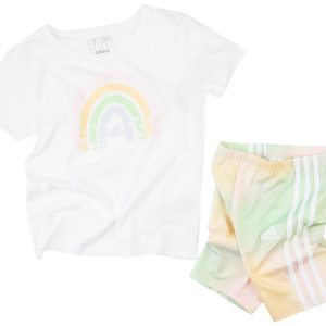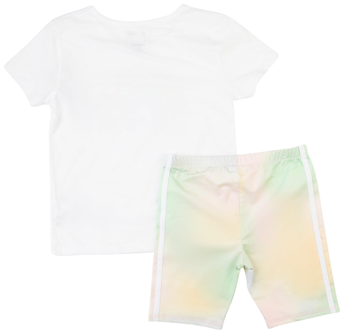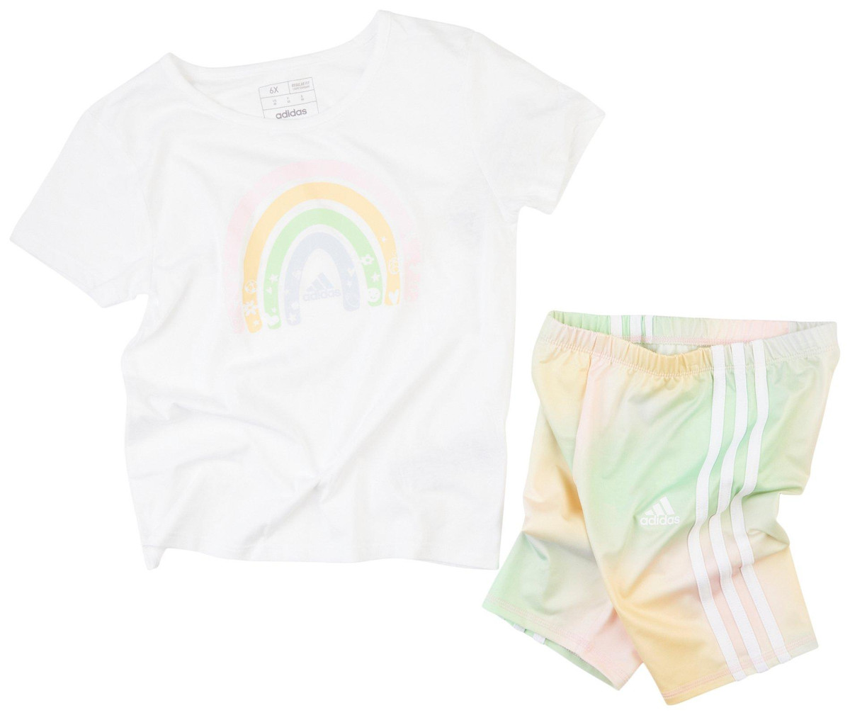 This two piece active set for little girls includes a short sleeve top with a fun rainbow screen print and pull on ombre bike shorts. Designed for comfort and movement, it is perfect for playtime, sports, or casual wear. Fabrication 60% cotton, 40% polyester
