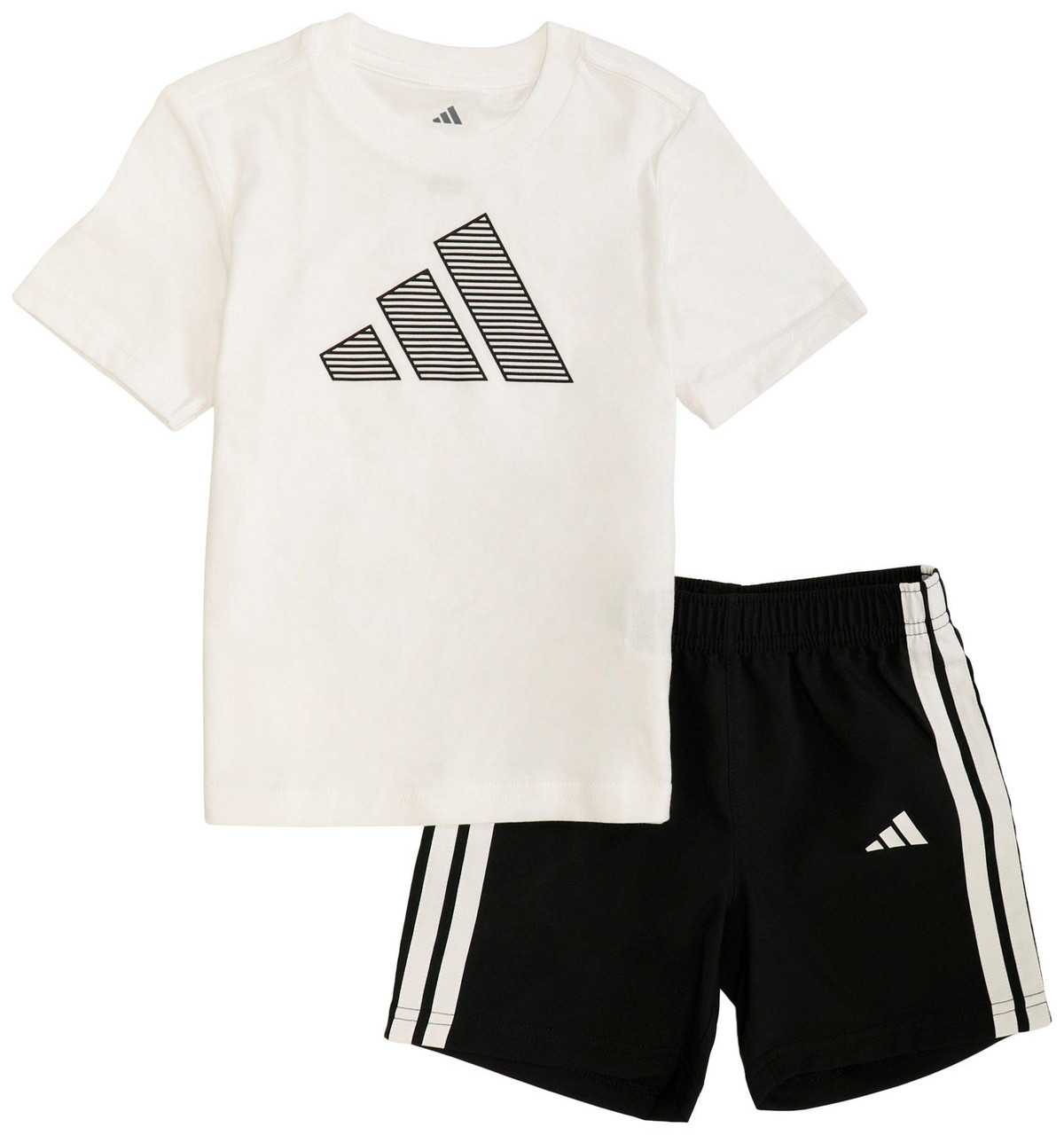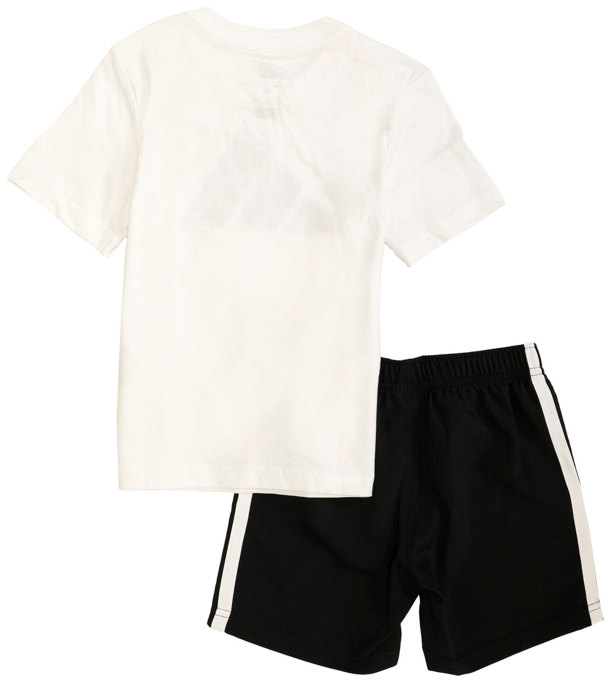 Keep him moving in comfort with this Toddler Boys Active 2 Pc Shirt Shorts Set, featuring a cotton short sleeve shirt with a logo print, paired with polyester shorts detailed with side stripes. Ideal for play, casual wear, and warm-weather activities.