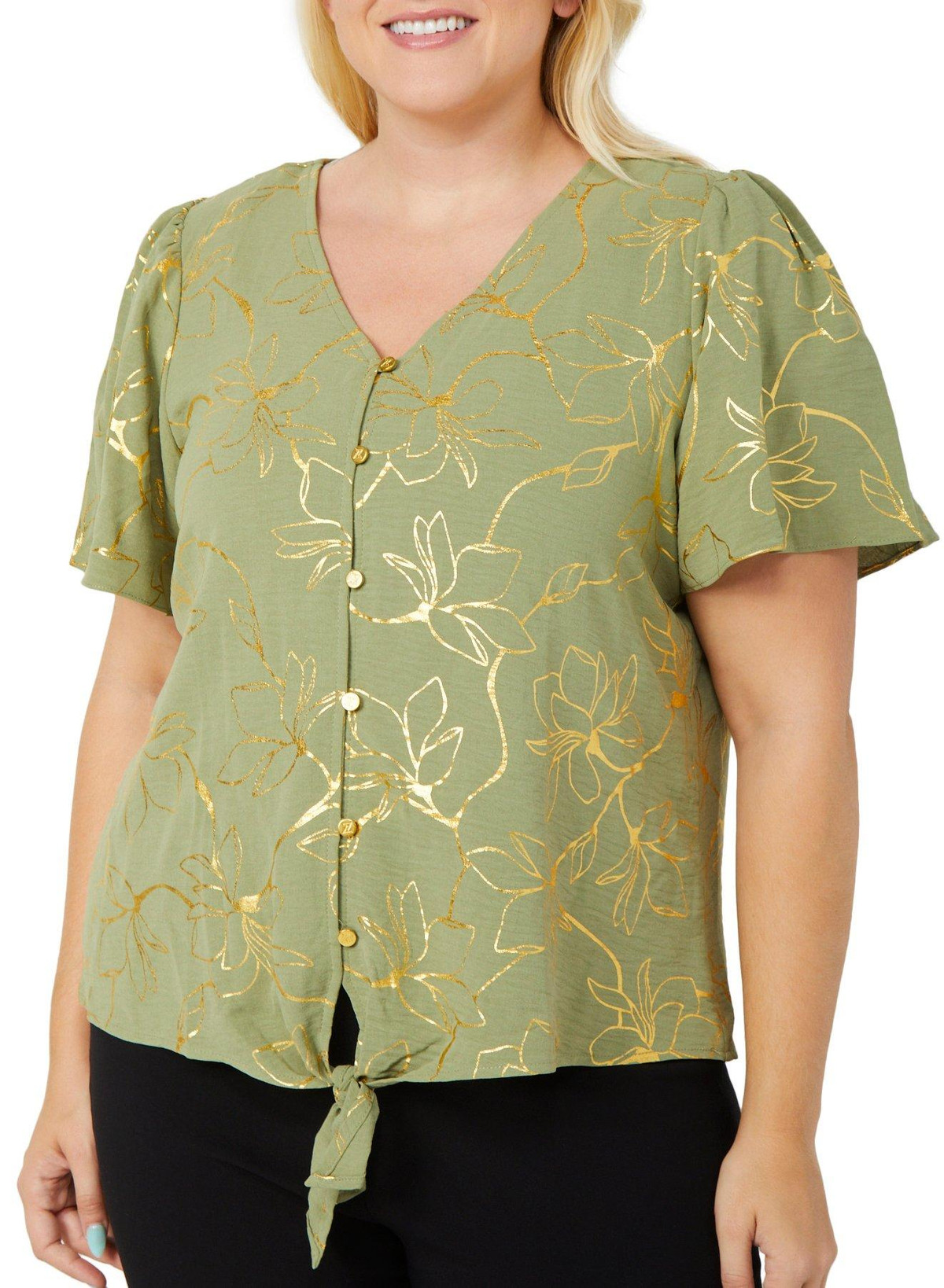 This Short Sleeve Dolman Top features eye catching metallic print designs, a tie front detail, and a buttoned front for added style. With its relaxed fit and soft feel, this top blends comfort and shine for an effortlessly chic look. Fabrication is 99% polyester, 1% metallic.