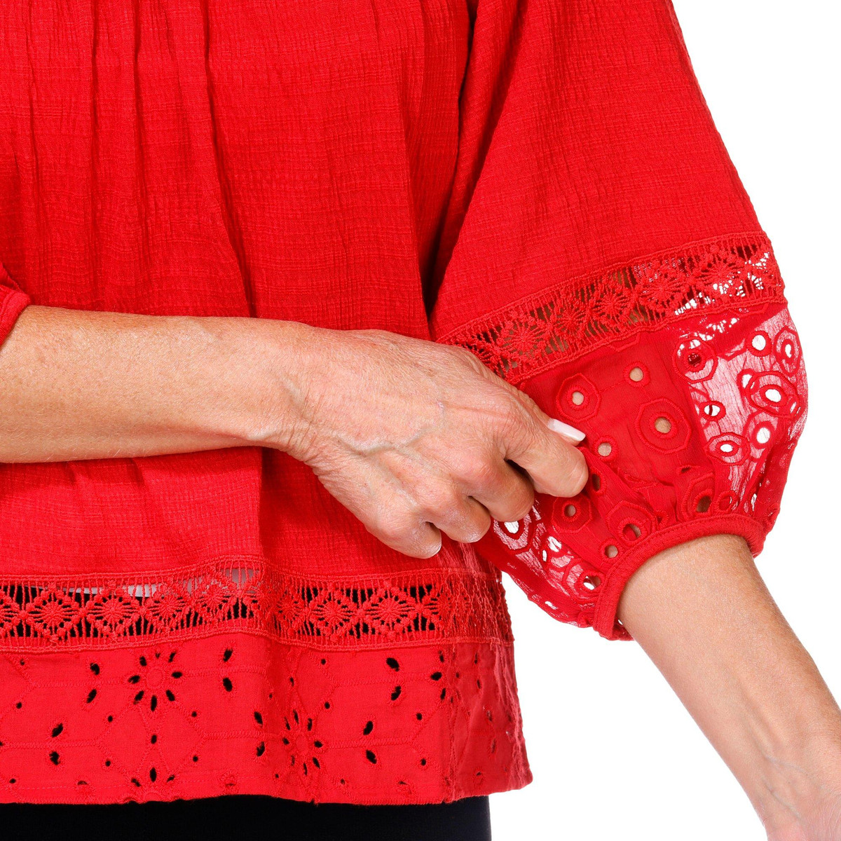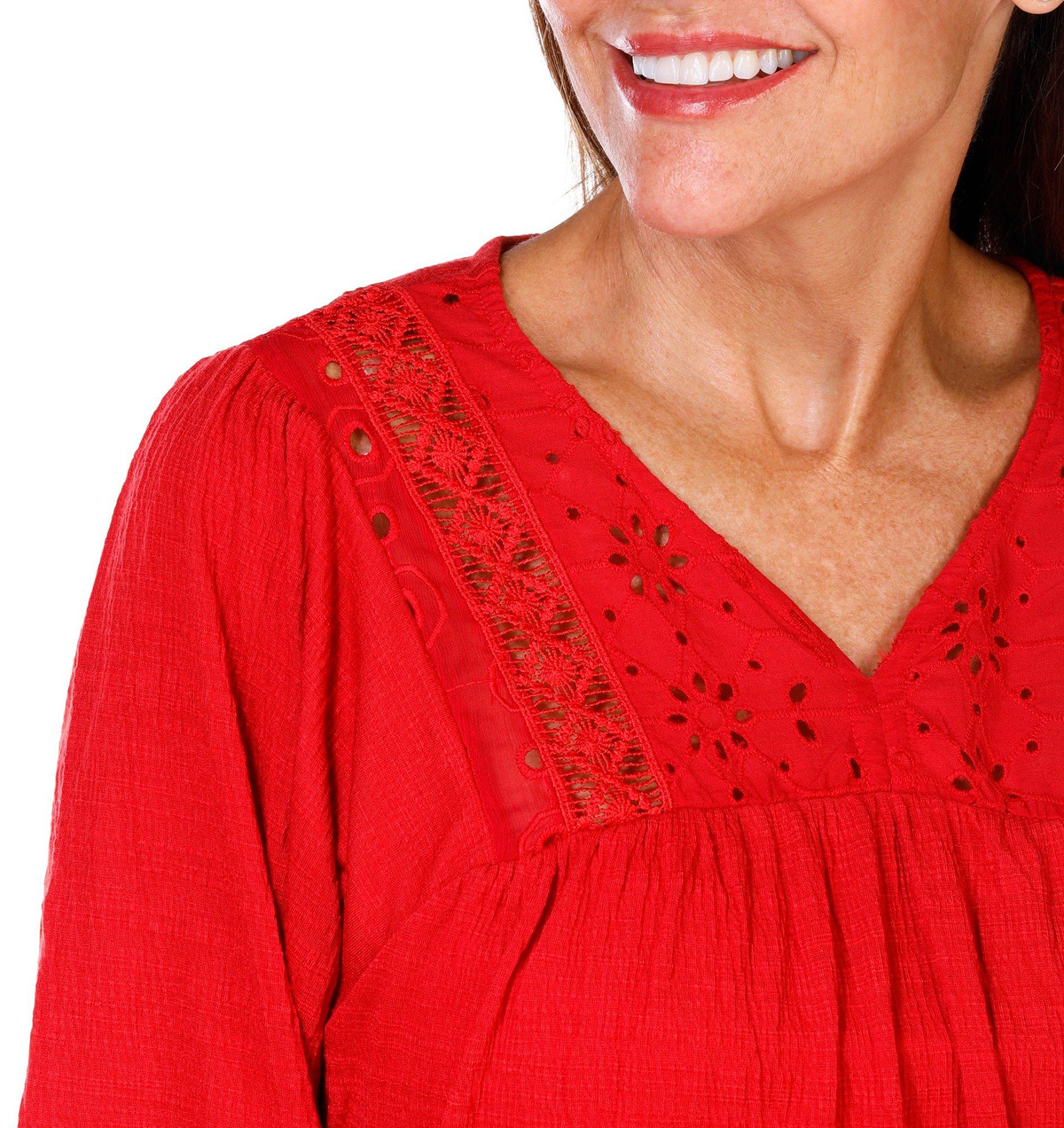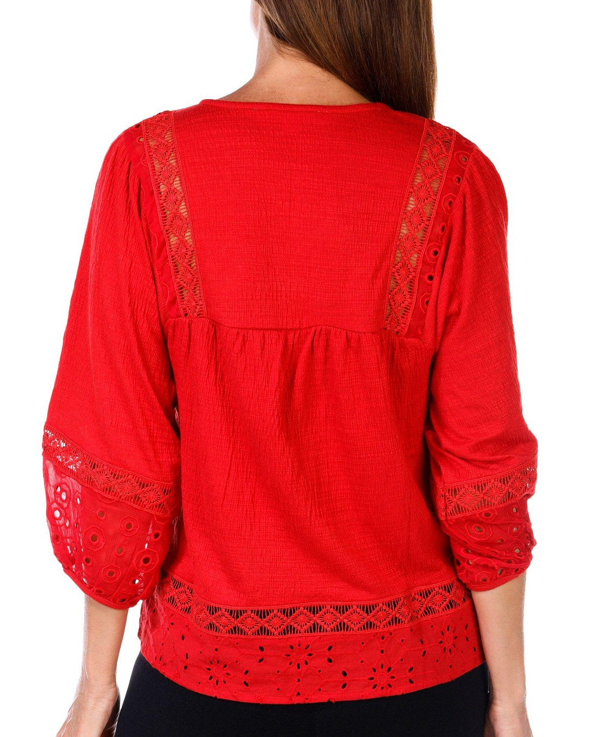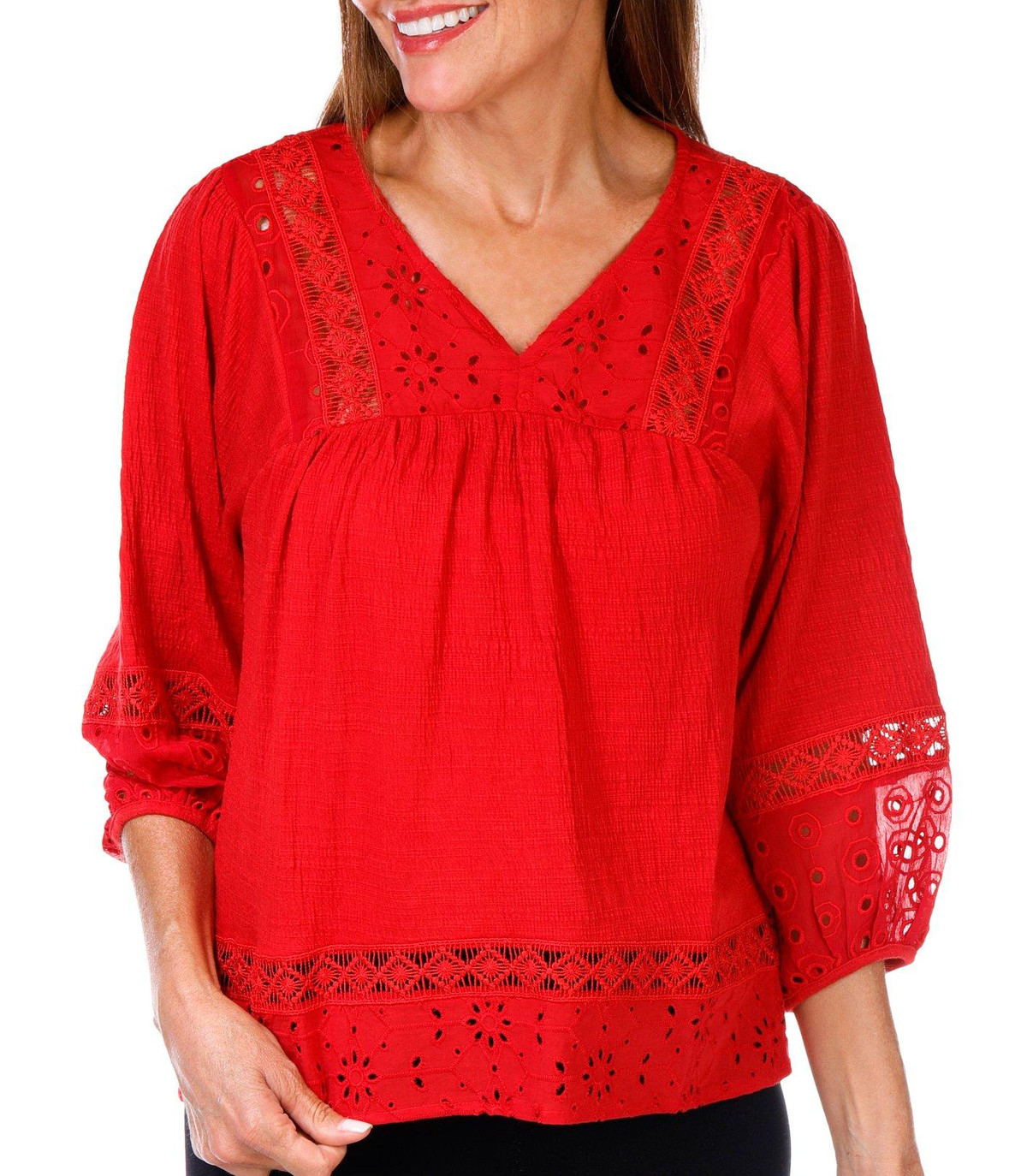 This textured knit blouse features a split neckline and delicate lace accents for added charm. Designed with 3/4 sleeves, this top offers a flattering fit and versatile style that transitions effortlessly from day to evening. Fabrication is 71% polyester, 28% rayon, and 1% spandex.