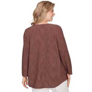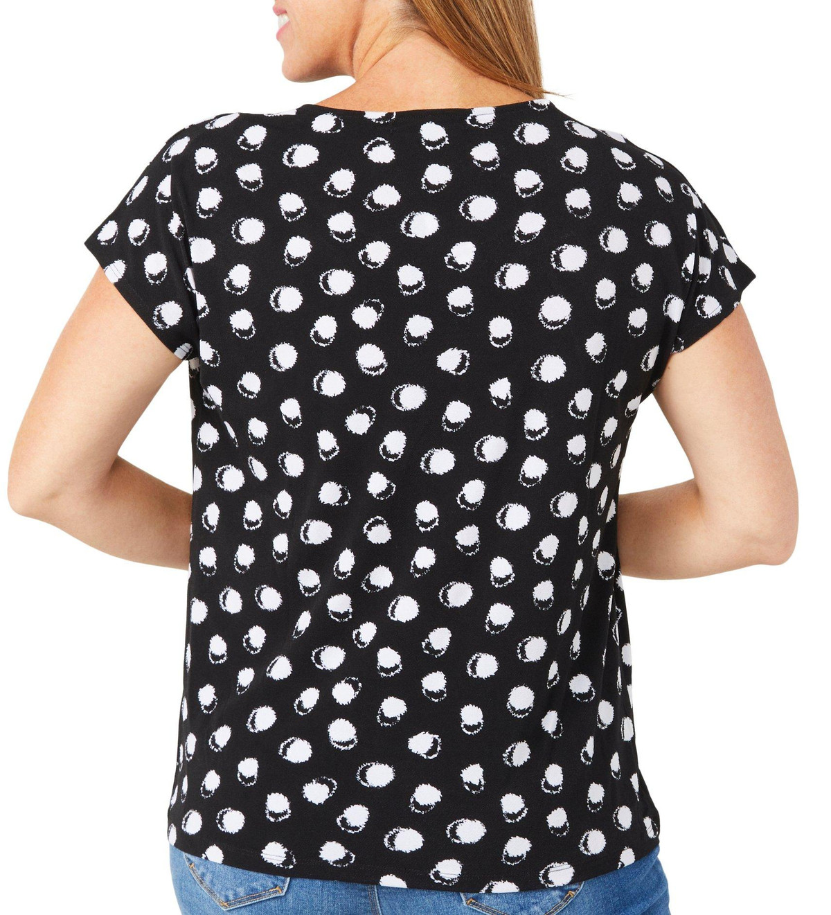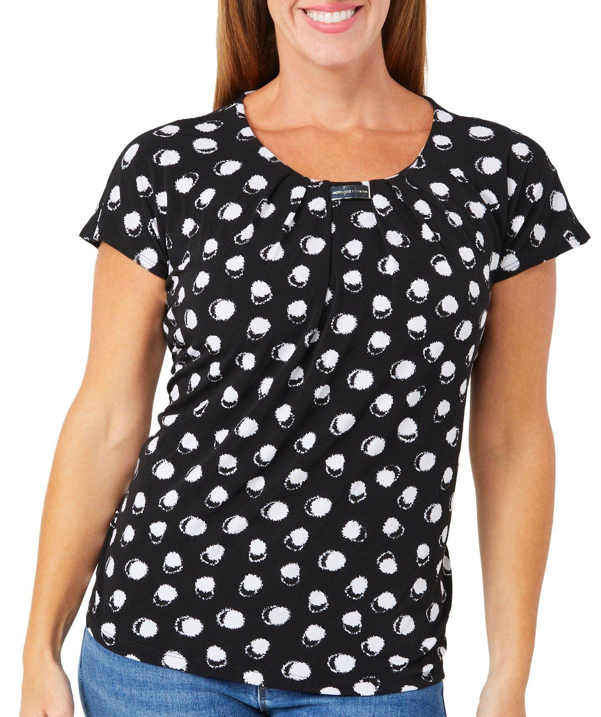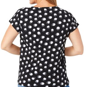 Soft and stylish, this Women’s Short Sleeve Dotted Print Top features a charming tulip print, short sleeves, and a crew neckline with pleated detail. A sleek metal accent adds a modern touch, making it perfect for both work and weekend wear. Fabrication 95% polyester, 5% spandex