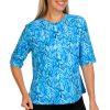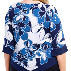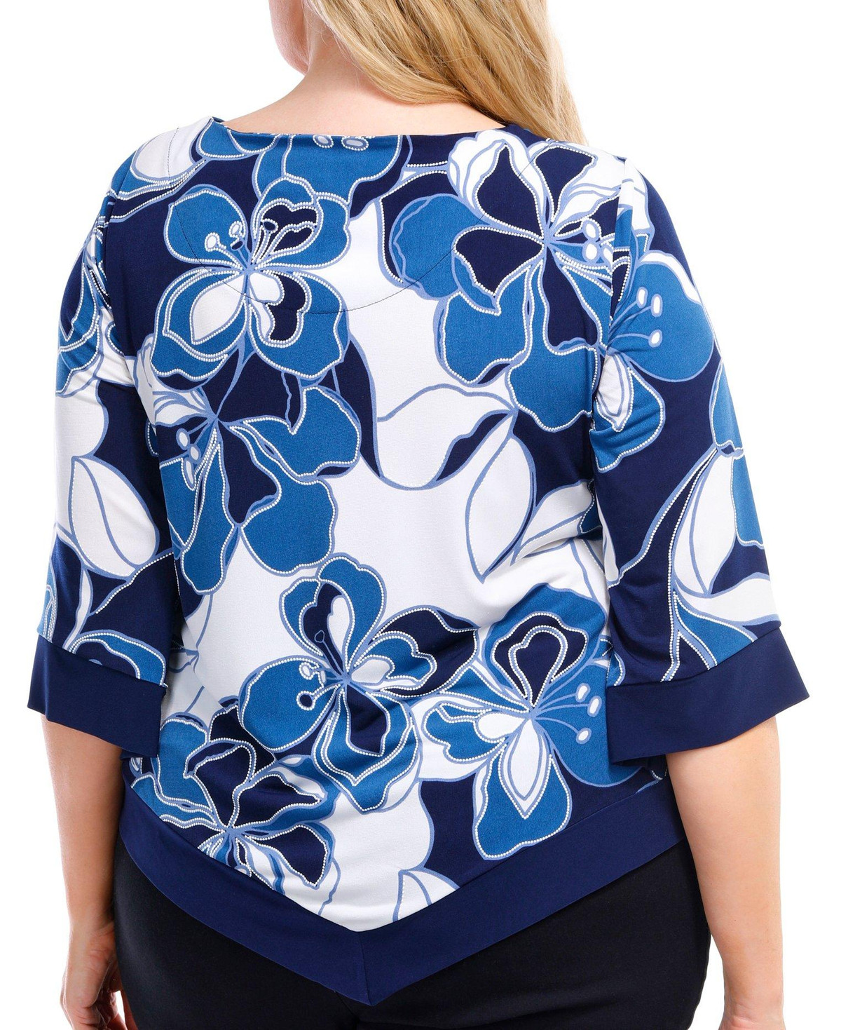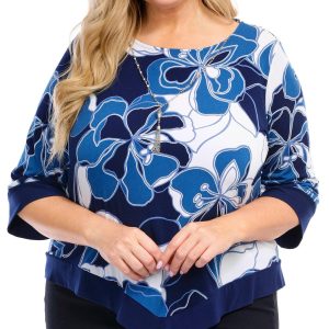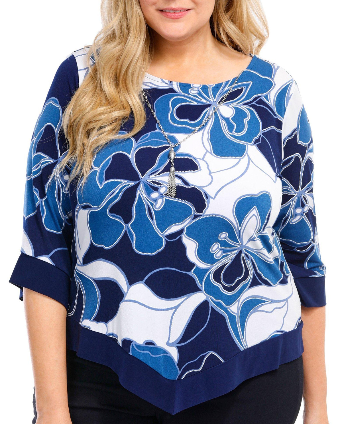Add a touch of personality to your denim wardrobe with this unique top. The vibrant floral patchwork pattern creates a captivating design. The sharkbite hemline adds a modern edge, while the included necklace completes the look. Top length is 26 inches.