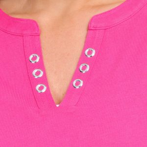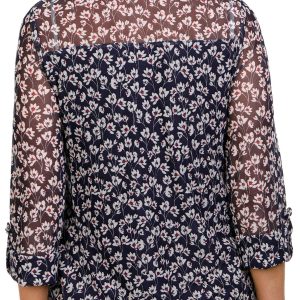 Add a touch of personality to your denim wardrobe with this unique top. The vibrant floral patchwork pattern creates a captivating design. The sharkbite hemline adds a modern edge, while the included necklace completes the look. Top length is 26 inches.
