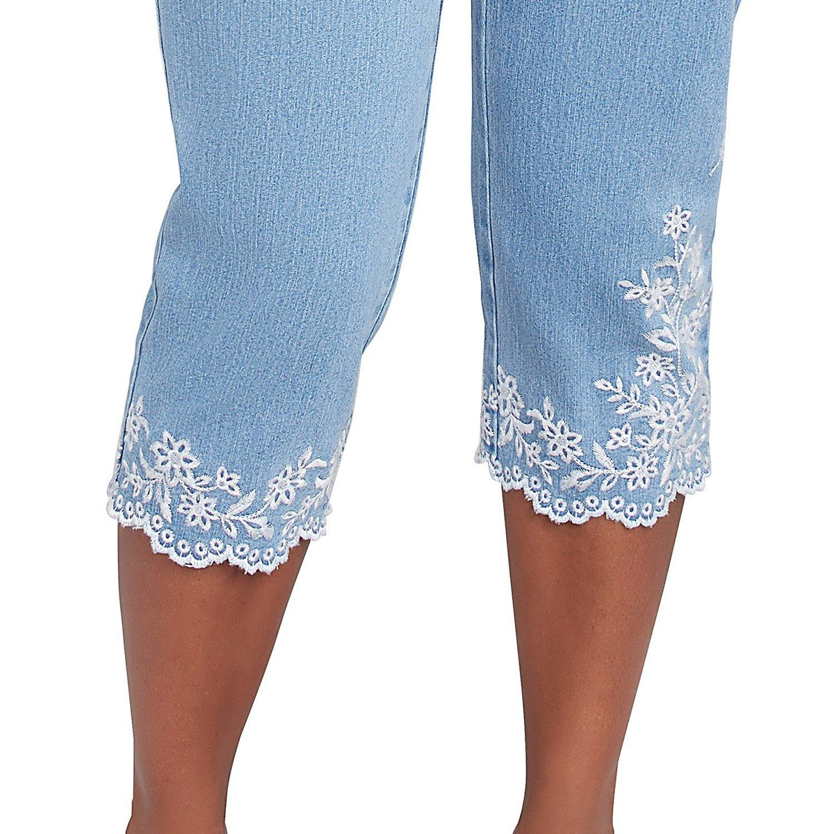 These floral embroidered capri pants offer a delightful mix of charm and comfort, featuring delicate embroidery below the left pocket and flowing up the right leg for a unique, artistic touch. A lace insert at the hem adds a soft, feminine detail, while the mid-rise fit and front pockets provide both style and practicality. Inseam measures 18.75 in. Fabrication is 69% Cotton, 28% Polyester, 3% Spandex.