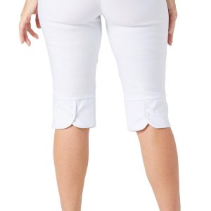 These floral embroidered capri pants offer a delightful mix of charm and comfort, featuring delicate embroidery below the left pocket and flowing up the right leg for a unique, artistic touch. A lace insert at the hem adds a soft, feminine detail, while the mid-rise fit and front pockets provide both style and practicality. Inseam measures 18.75 in. Fabrication is 69% Cotton, 28% Polyester, 3% Spandex.