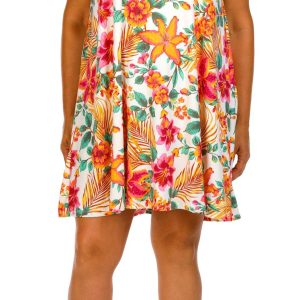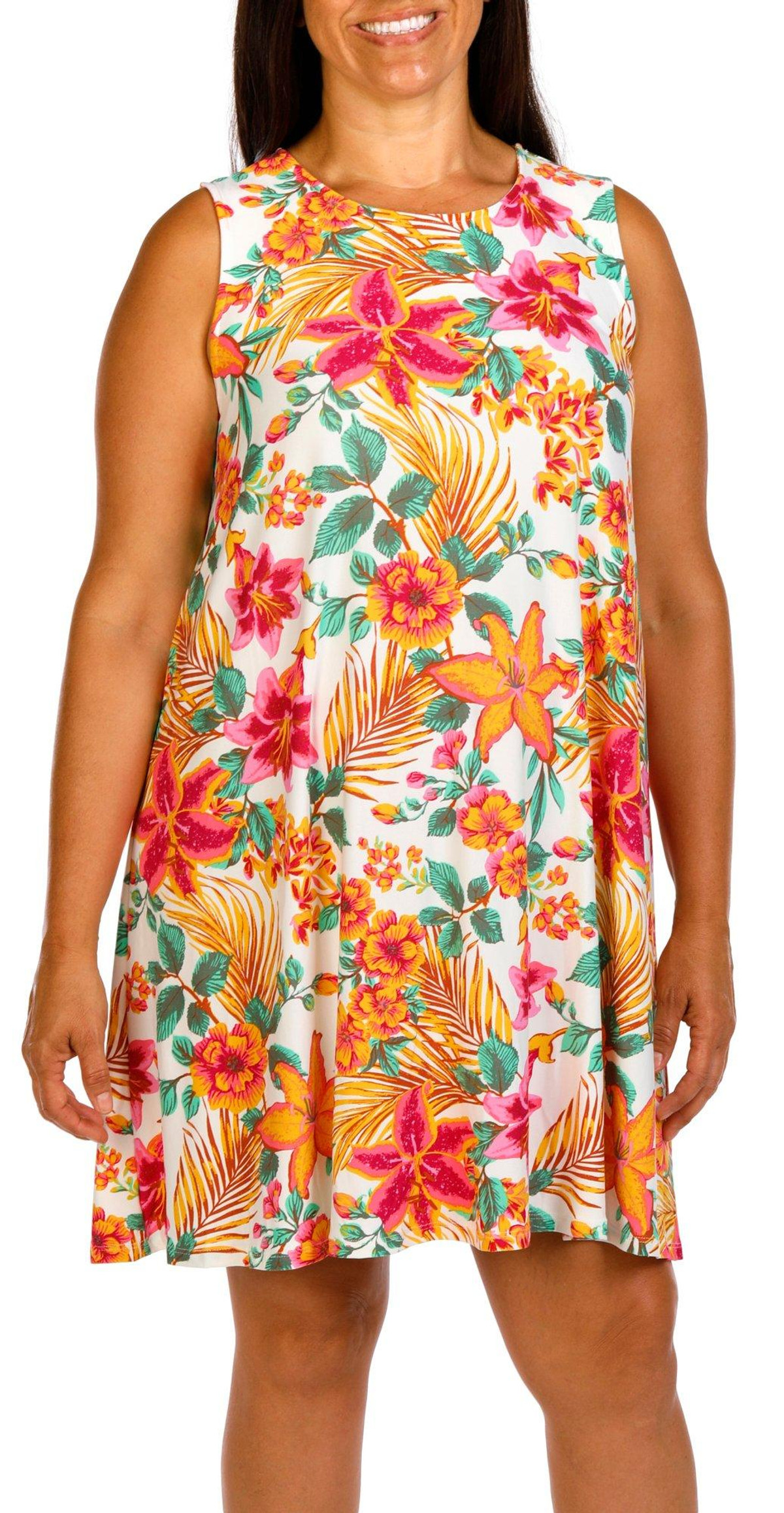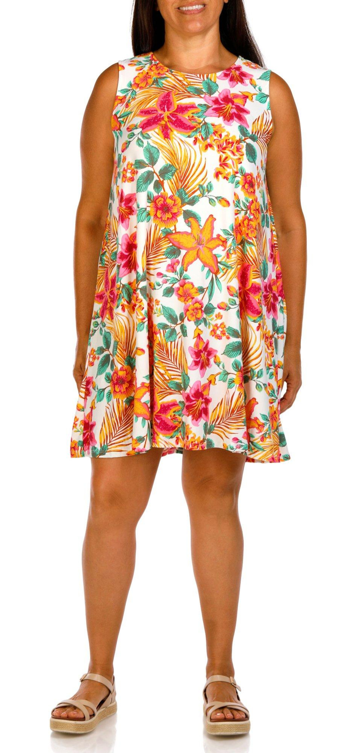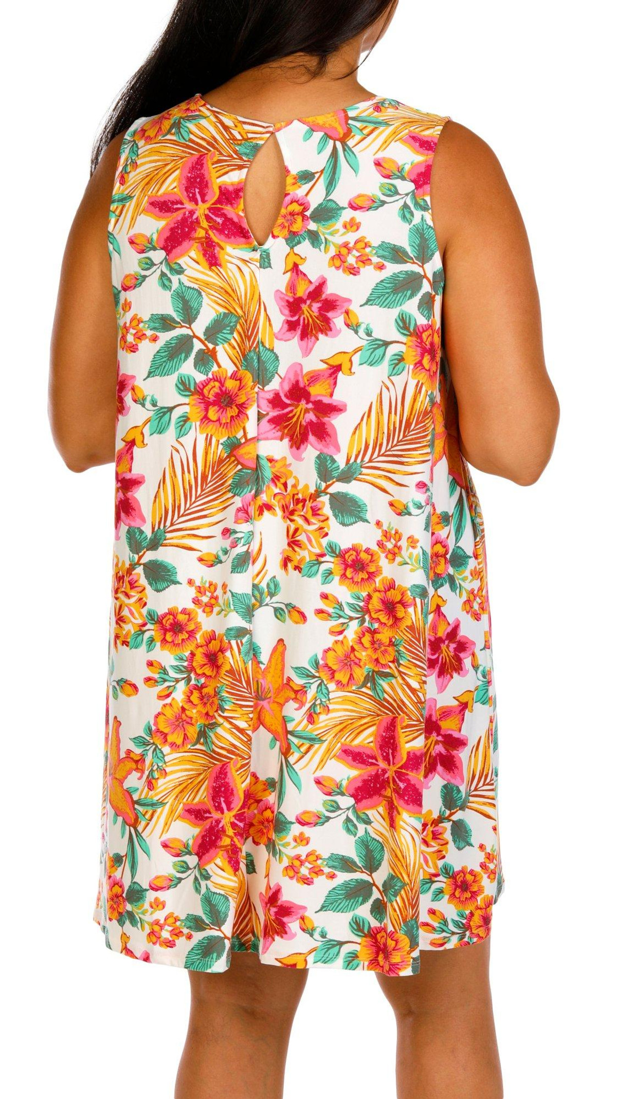This plus size sleeveless floral swing dress features a classic crew neckline and a back keyhole detail for added charm. The flowing silhouette and floral print create a breezy and stylish look perfect for warm days or casual outings. Fabrication is 92% polyester, 8% spandex