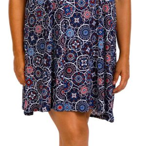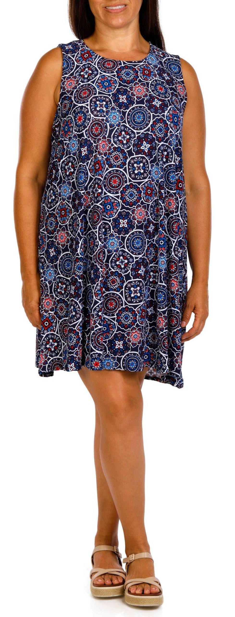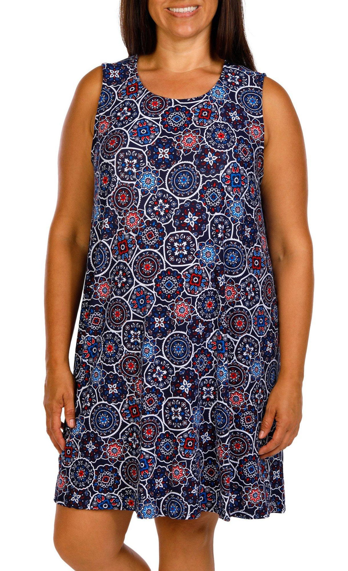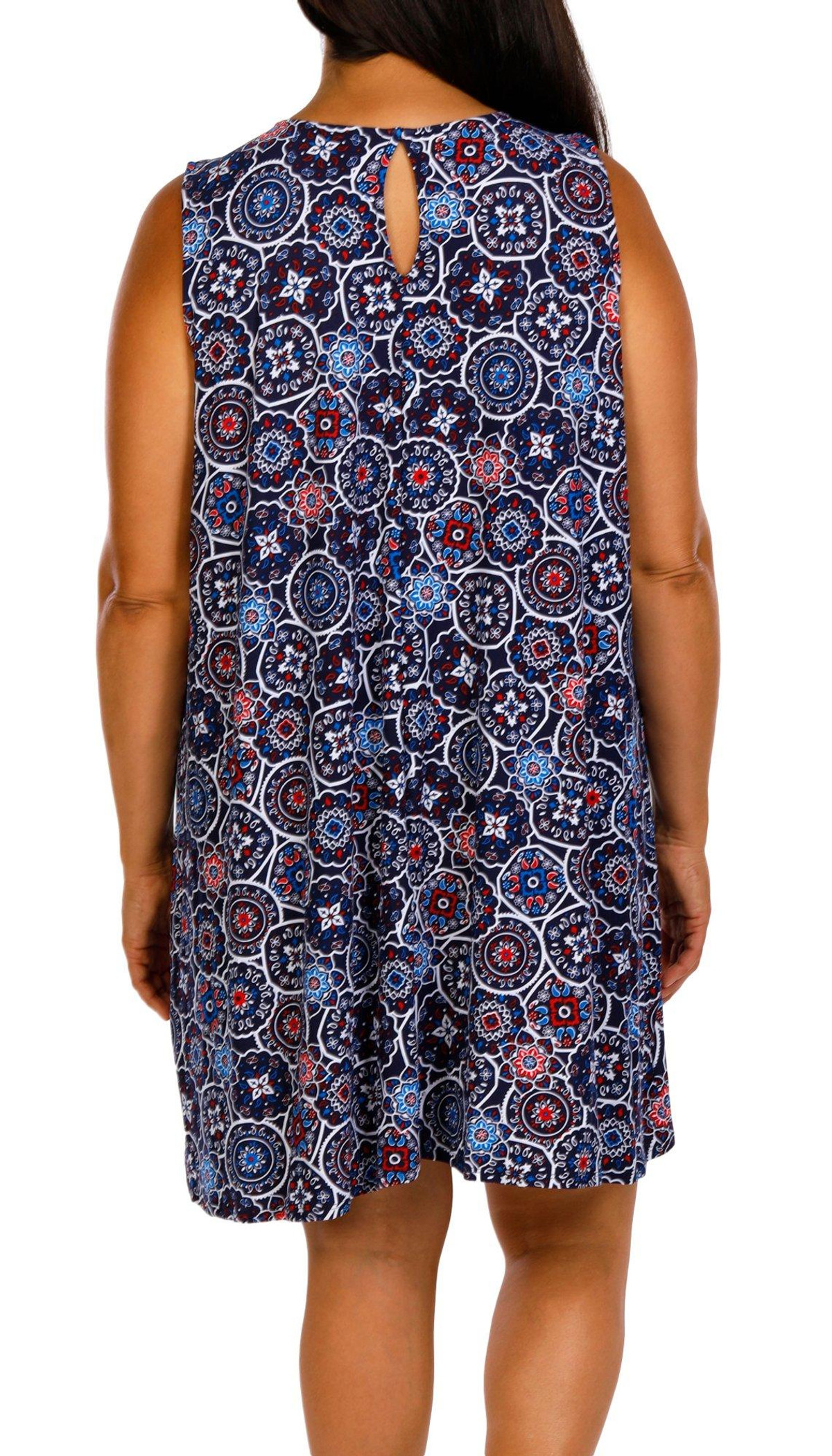 This plus size sleeveless mandala swing dress features a classic crew neckline and a back keyhole detail for added charm. The flowing silhouette and intricate mandala print create a breezy and stylish look perfect for warm days or casual outings. Fabrication is 92% polyester, 8% spandex.