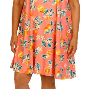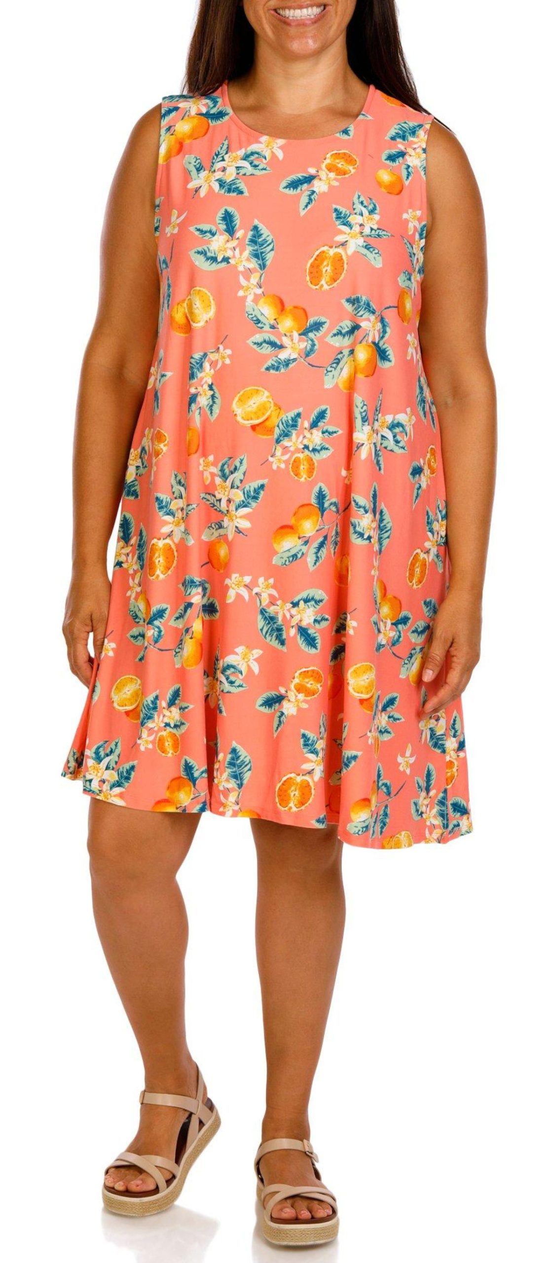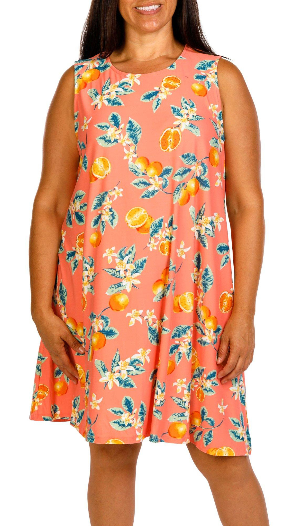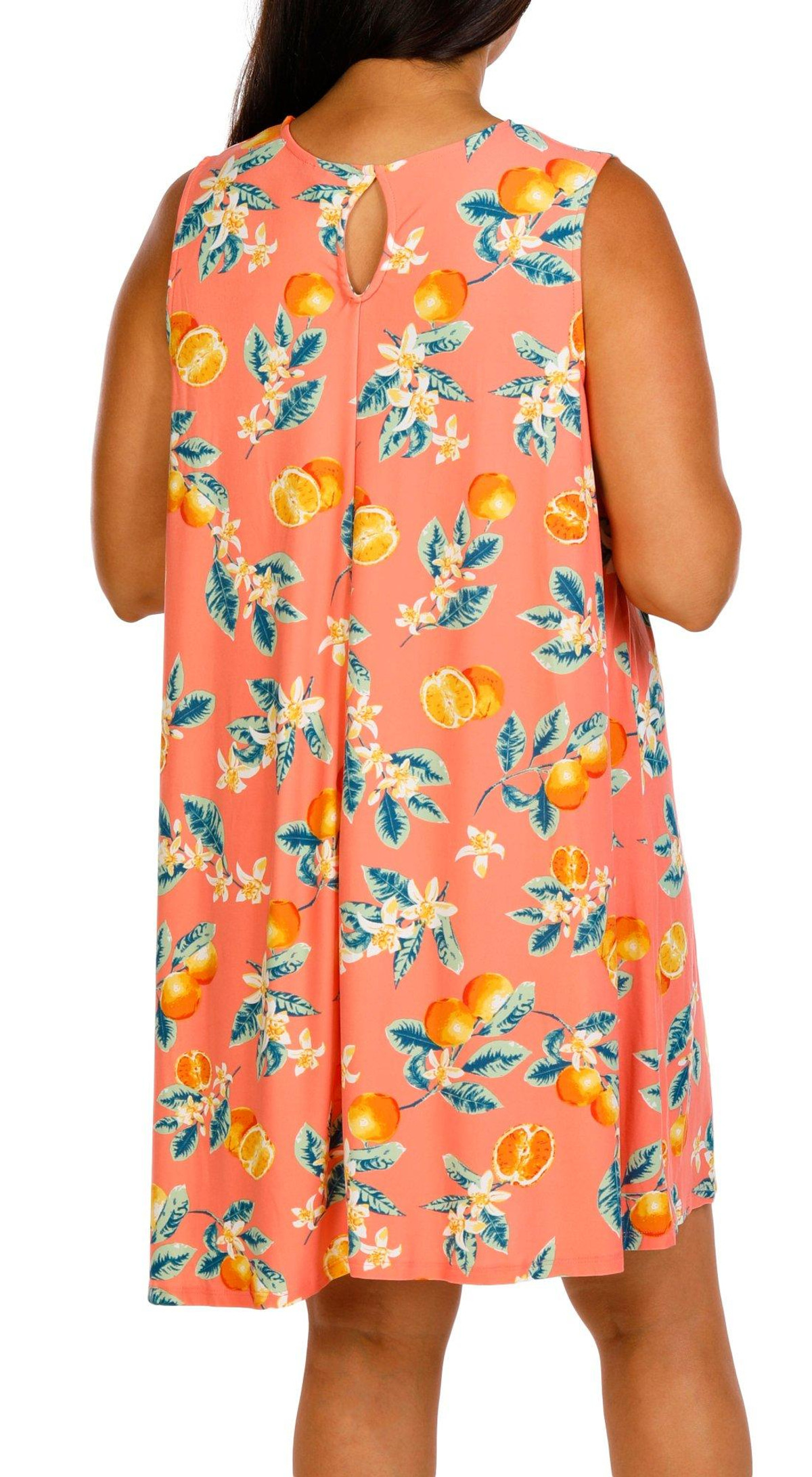 This plus size sleeveless orange swing dress features a classic crew neckline and a back keyhole detail for added charm. The flowing silhouette and orange fruit print create a breezy and stylish look perfect for warm days or casual outings. Fabrication is 92% polyester, 8% spandex