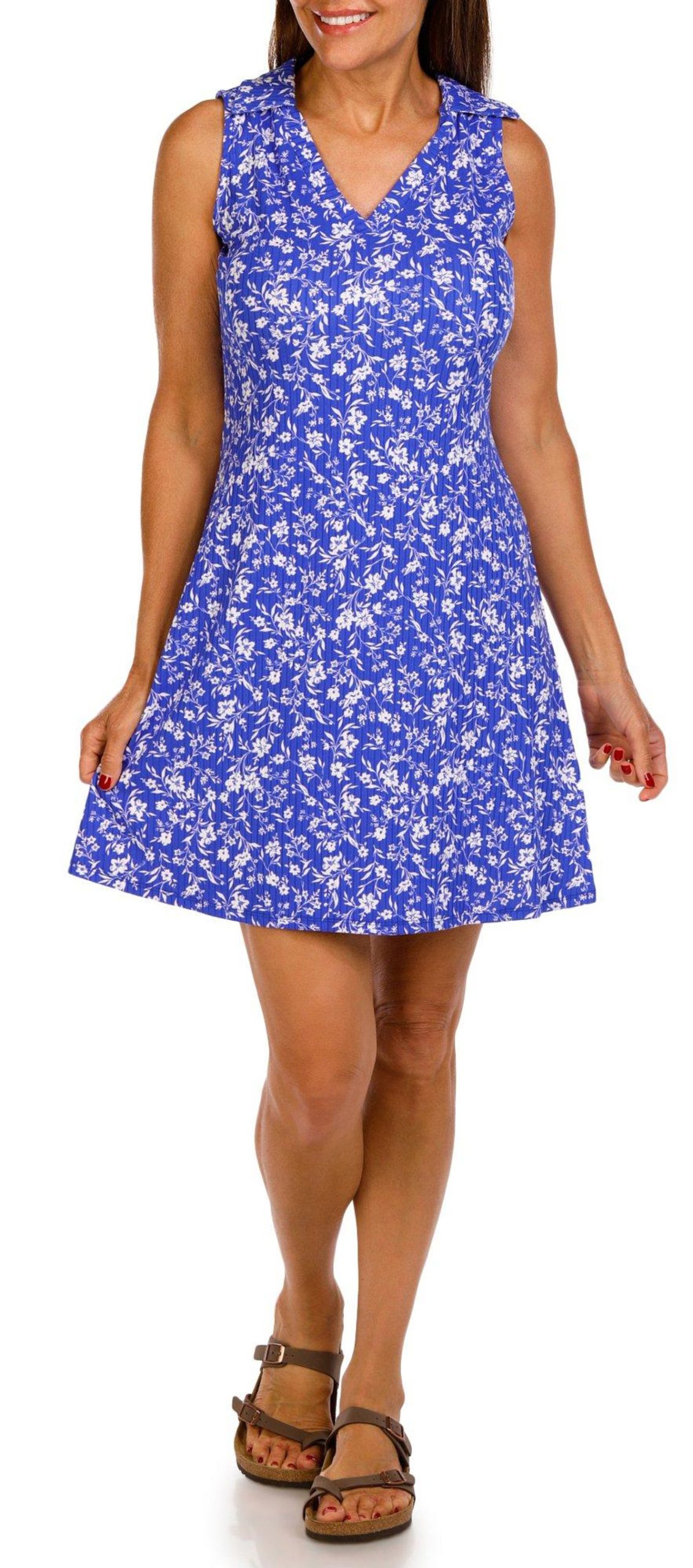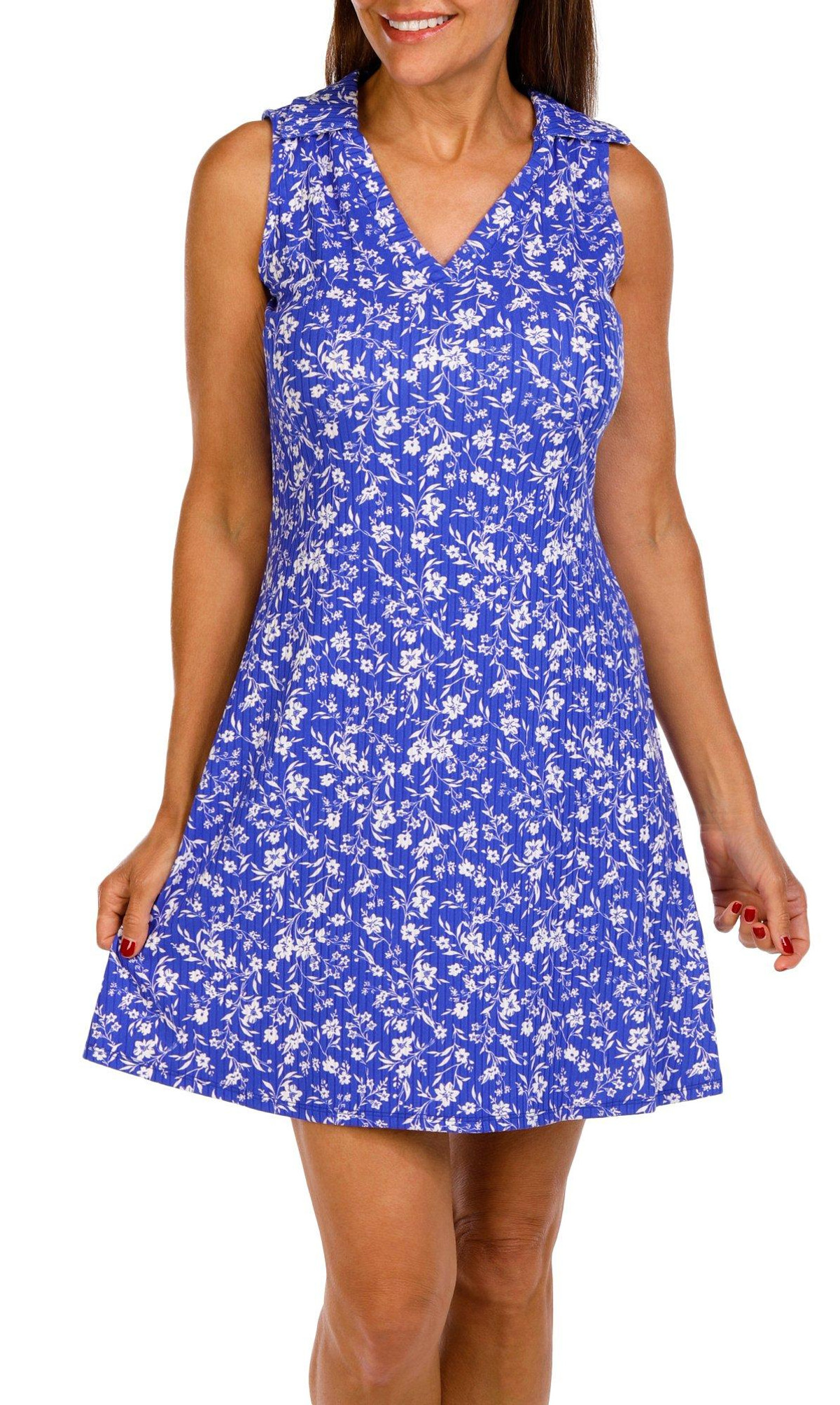 The Women’s Sleeveless Ribbed Polo Dress combines comfort and classic style with its flowy silhouette and charming print. Designed to flatter every body type, this dress offers a relaxed fit and soft fabric that moves with you. Perfect for warm weather, it is ideal for casual outings or dressing up for special occasions. Measures approximately 36 in. Fabrication is 92% polyester, 8% spandex.