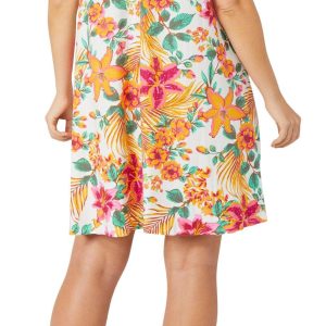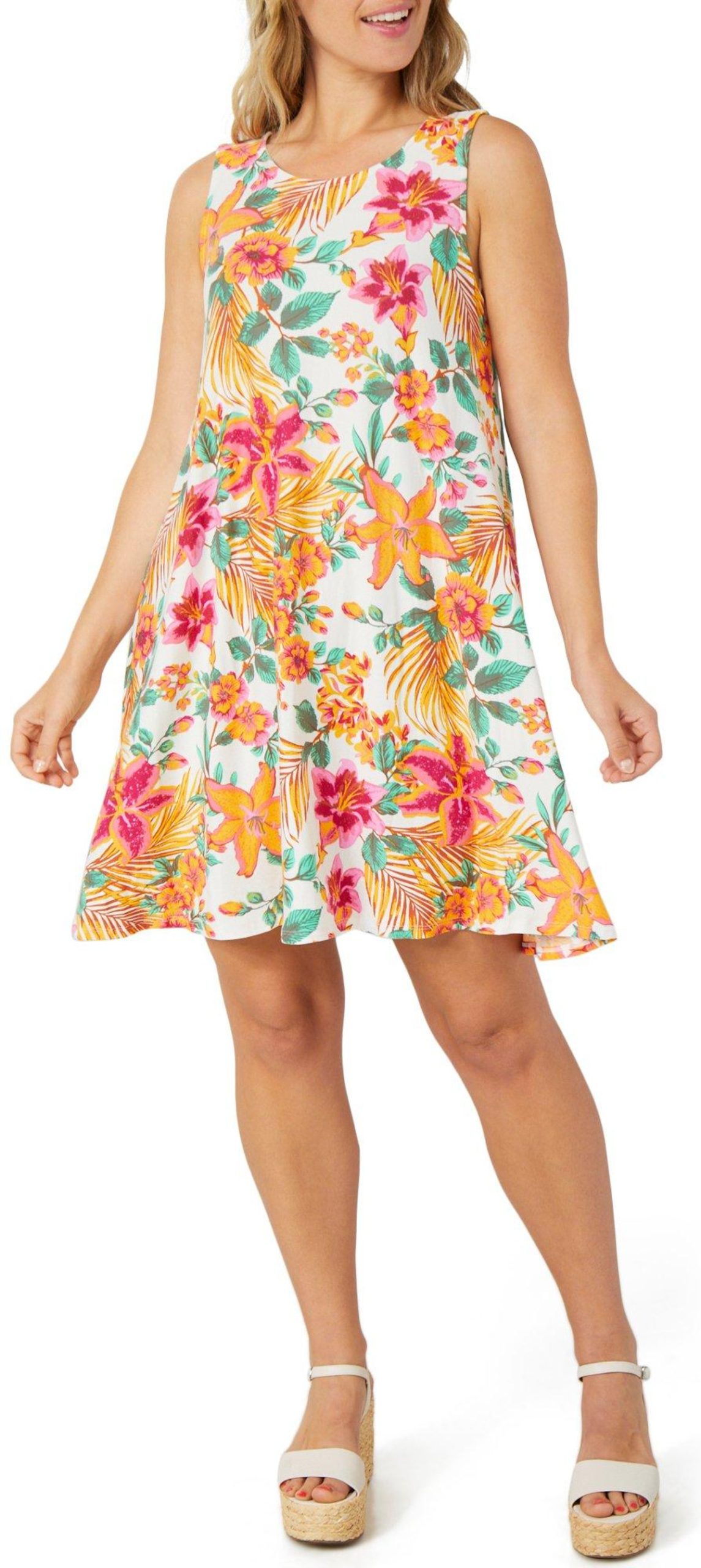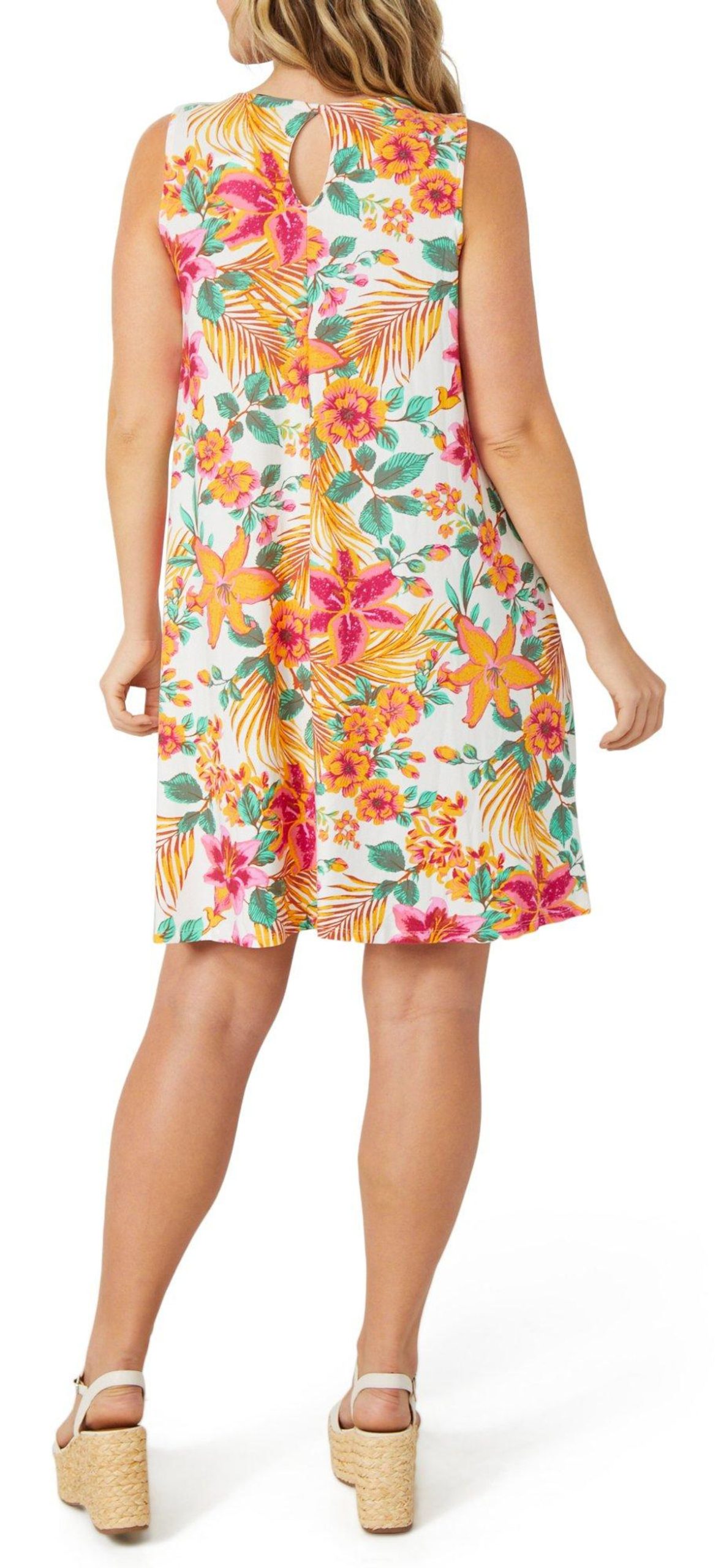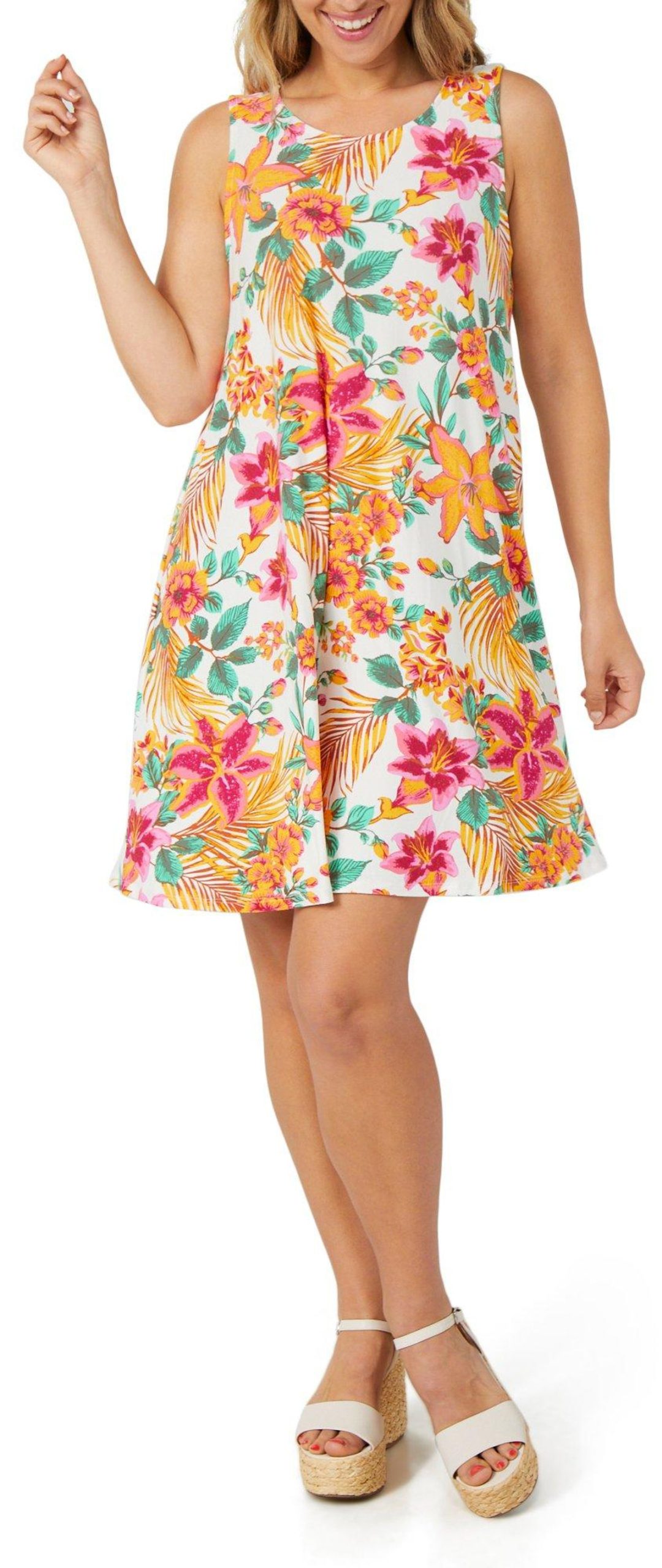 The Women’s Sleeveless Swing Dress combines comfort and style with its flowy silhouette and tropical print. Designed to flatter every body type, this dress offers a relaxed fit and soft fabric that moves with you. Perfect for warm weather, it is ideal for casual outings or dressing up for special occasions. Fabrication is 92% polyester, 8% spandex