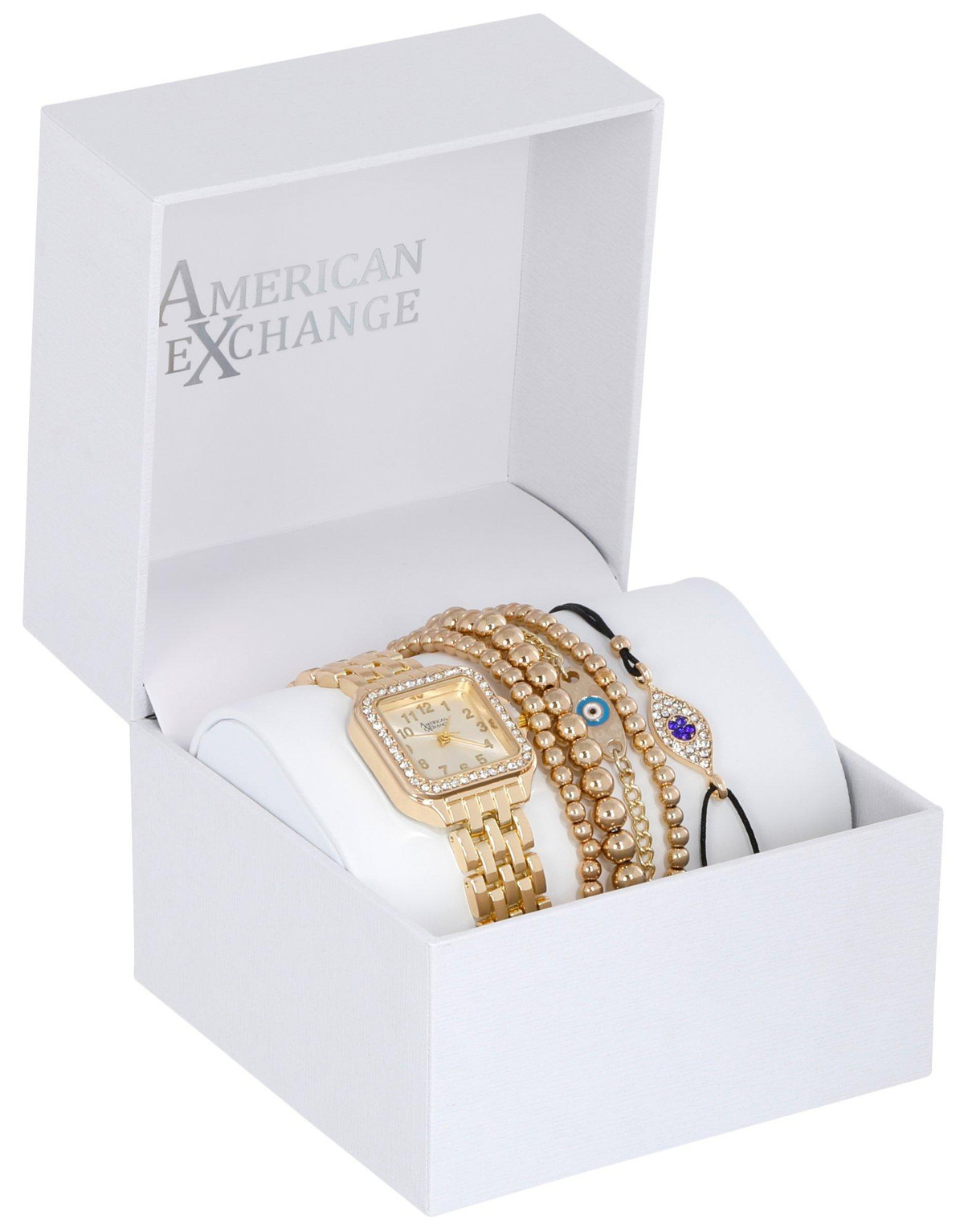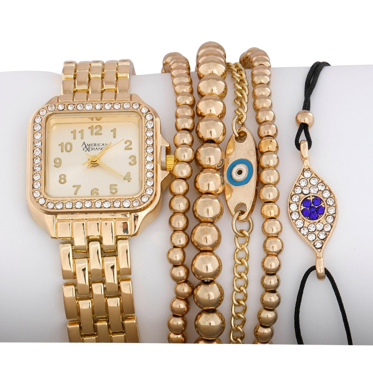 Elevate your accessory collection with the American Exchange Women’s Gold Evil Eye Boxed Watch Set. This stylish set features a sleek gold-tone mesh watch paired with coordinating bracelets, each adorned with the protective and symbolic evil eye charm. Presented in a chic gift-ready box, it’s the perfect present for loved ones or a treat for yourself. Whether dressing up for a special occasion or adding flair to everyday wear, this set offers versatility and timeless appeal.
