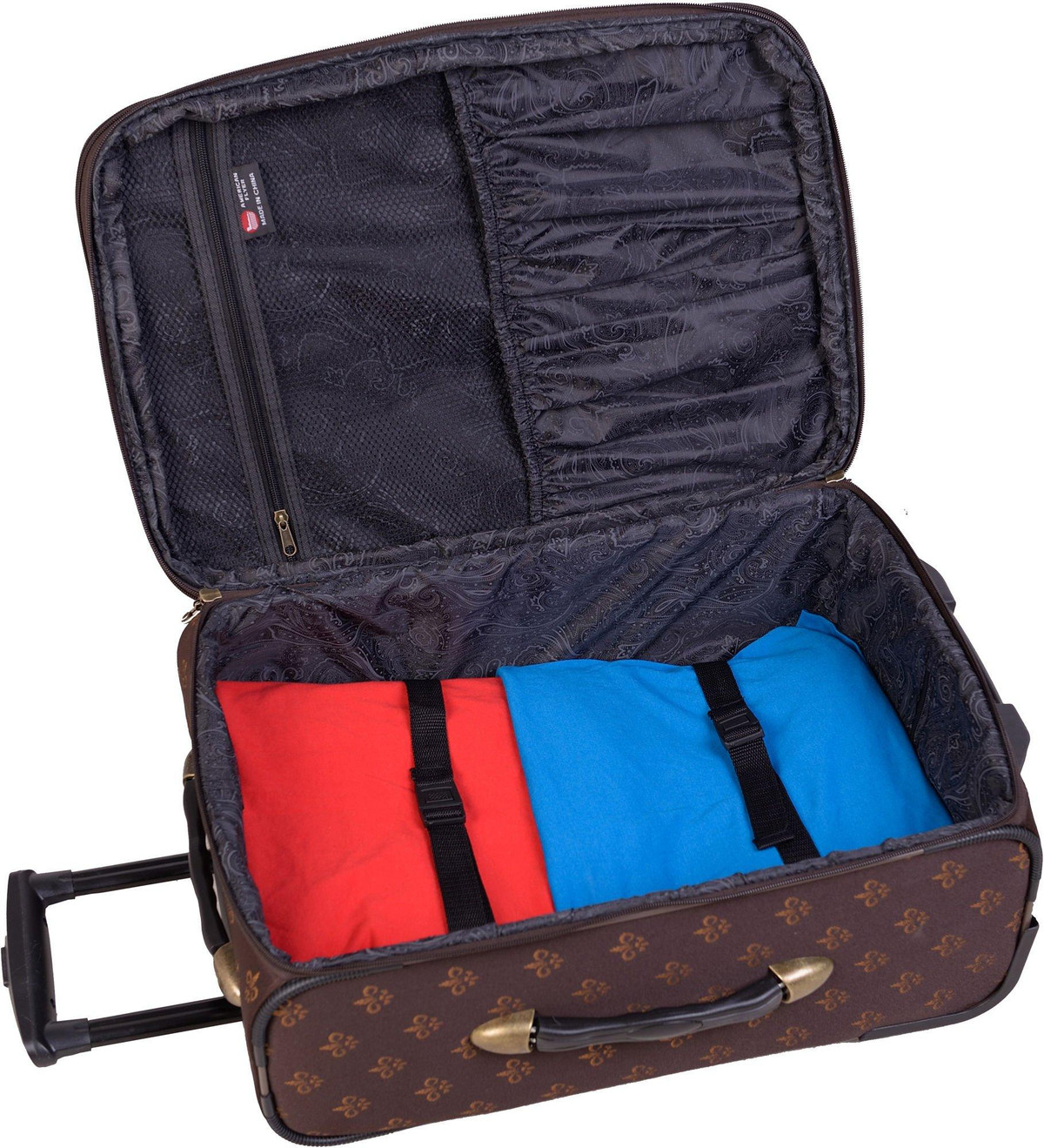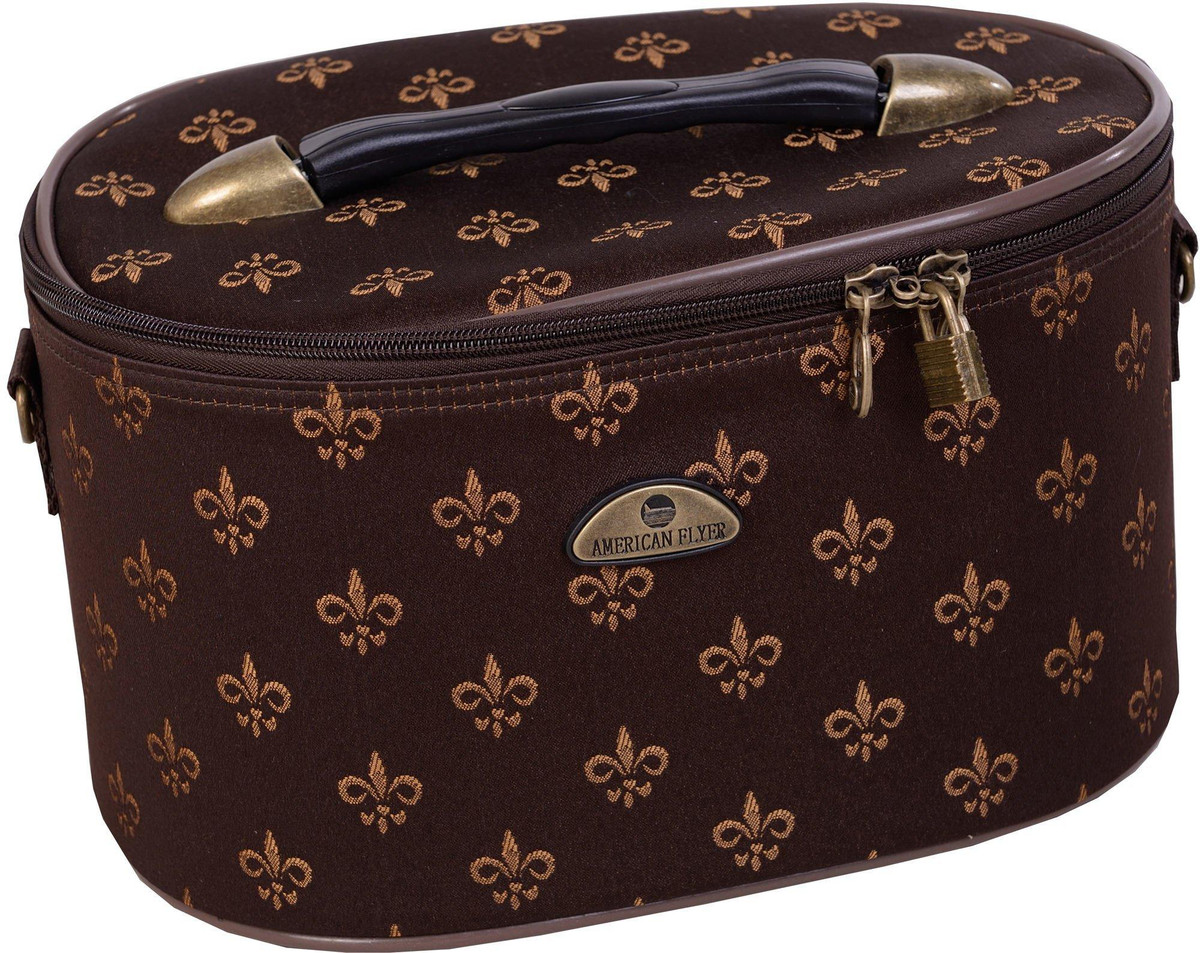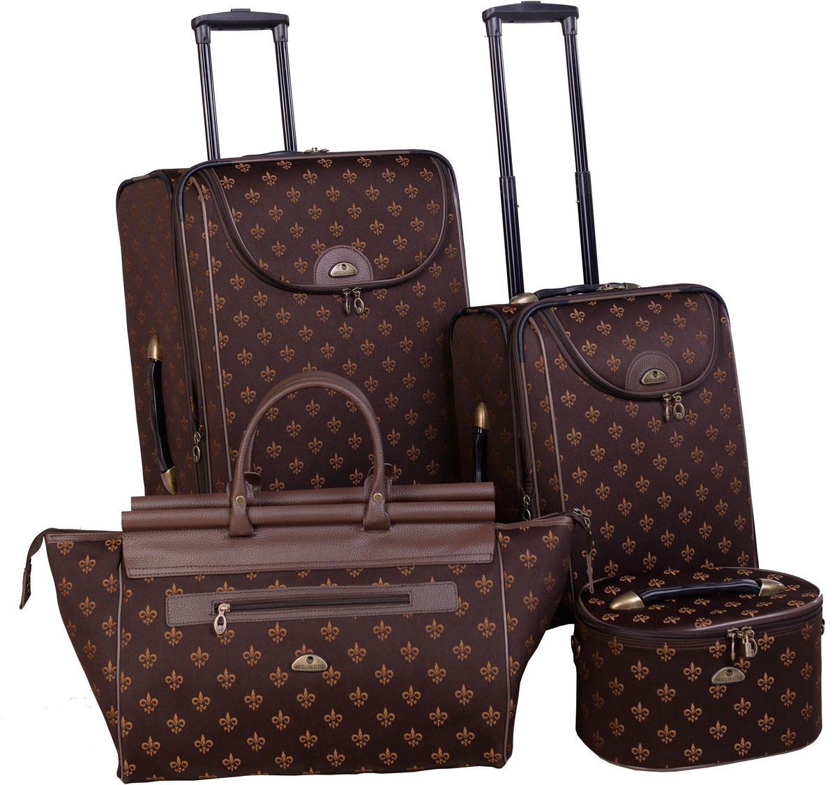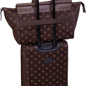 American Flyer Fleur De Lis Luggage Set includes 28” & 20” rolling expandable uprights as well as 19” doctor’s bag and cosmetic case (12” x 9”). Suitcase set features retractable telescoping handles, top & side carry handles, organizing pockets, and exterior pockets.