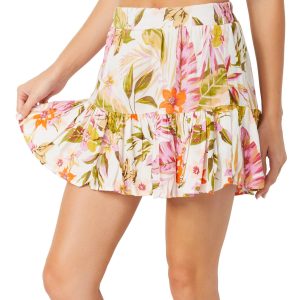 This juniors floral tier skirt features a charming ruffle tier design and a tropical floral print. The elastic waistband offers a comfortable fit, making it perfect for casual days or dressing up with ease and style. Fabrication 100% rayon.