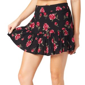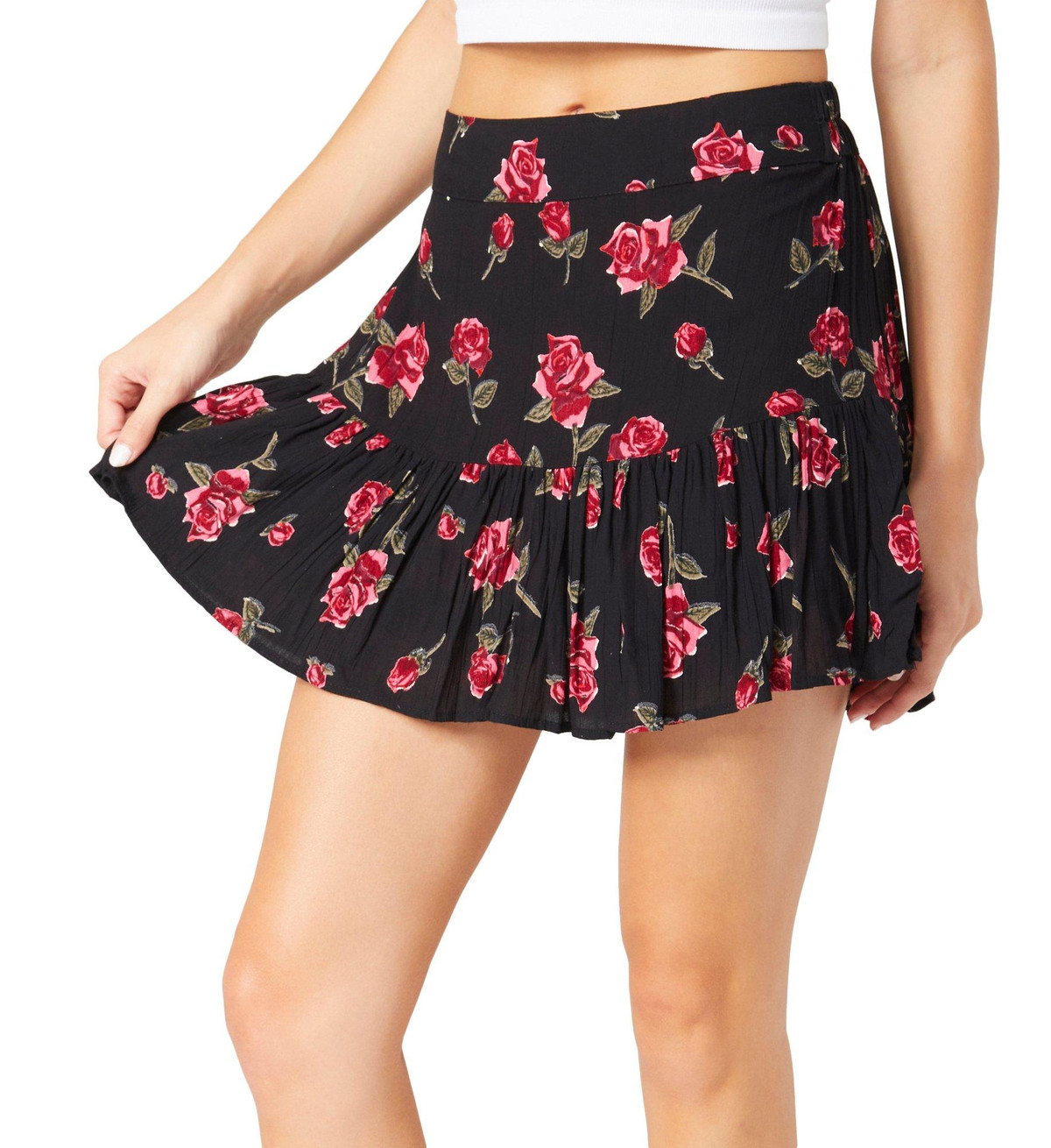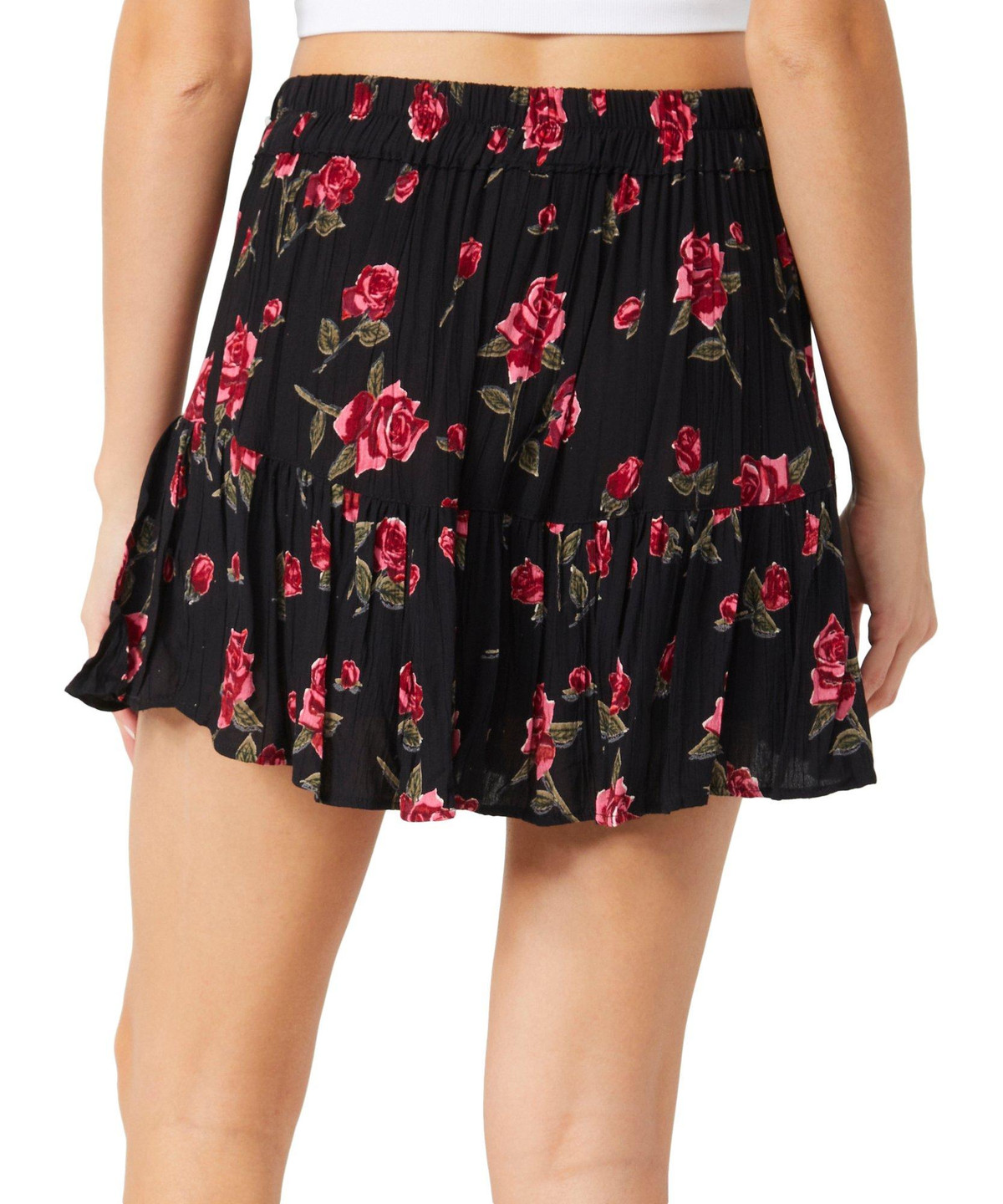 This juniors floral tier skirt features a charming ruffle tier design and a delicate floral print. The elastic waistband offers a comfortable fit, making it perfect for casual days or dressing up with ease and style. Fabrication 100% rayon.