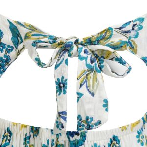 This sleeveless maxi dress features a stylish palm print on lightweight fabric, a v-neckline, front knotted detail, back pleated details, adjustable straps, a ruffled hemline, and a relaxed fit. The length measures approximately 55 in. Fabrication is 100% rayon.