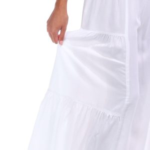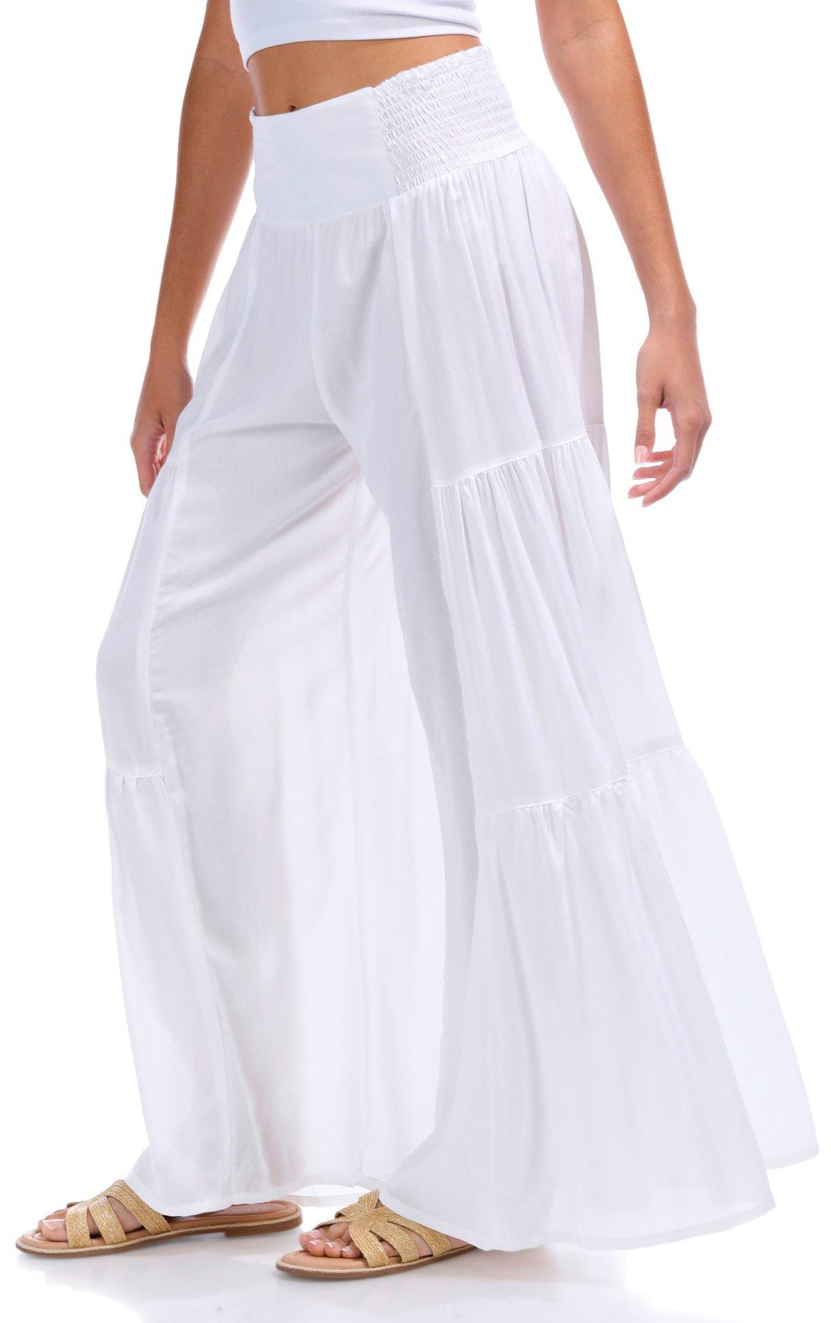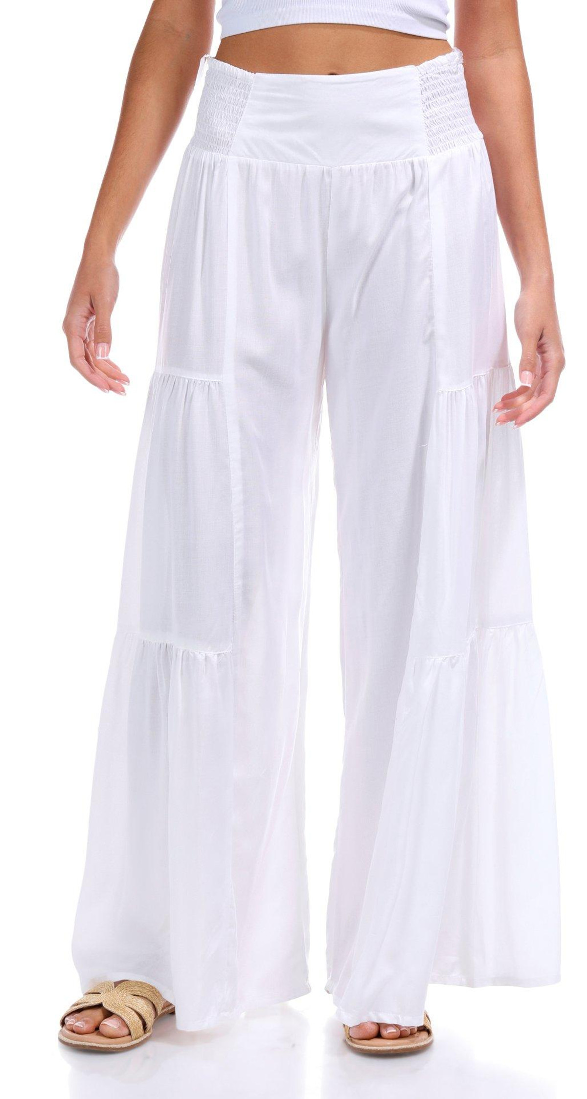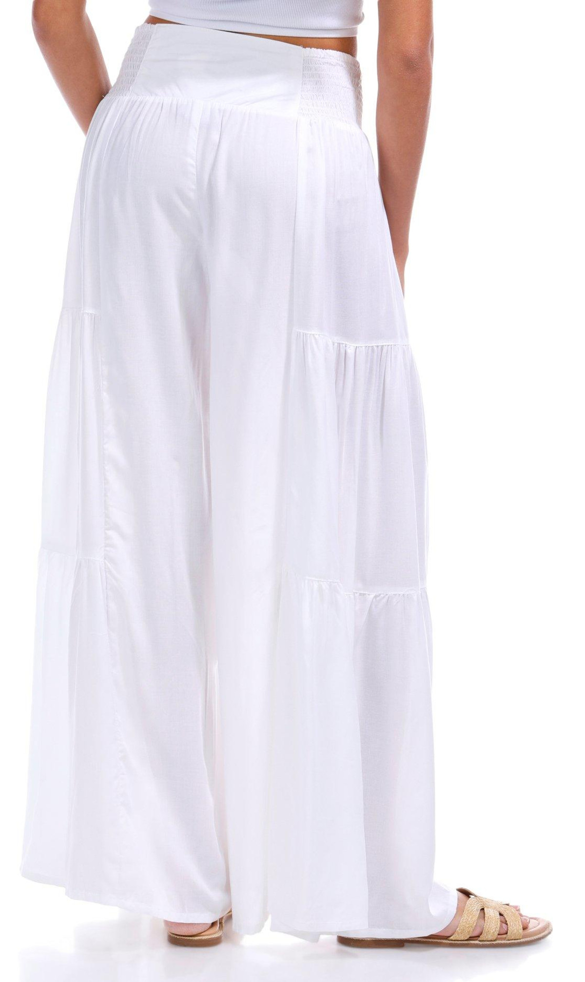Introducing the Juniors White Wide Leg Pants from Angie, crafted from rayon for a lightweight and comfortable feel. These stylish pants feature a crisp white color, tiered detailing on the sides, and a smocked pull-on waistband for easy wear. The flowy fit adds a touch of elegance, making them perfect for any casual or dressy occasion. 28 inch inseam.
