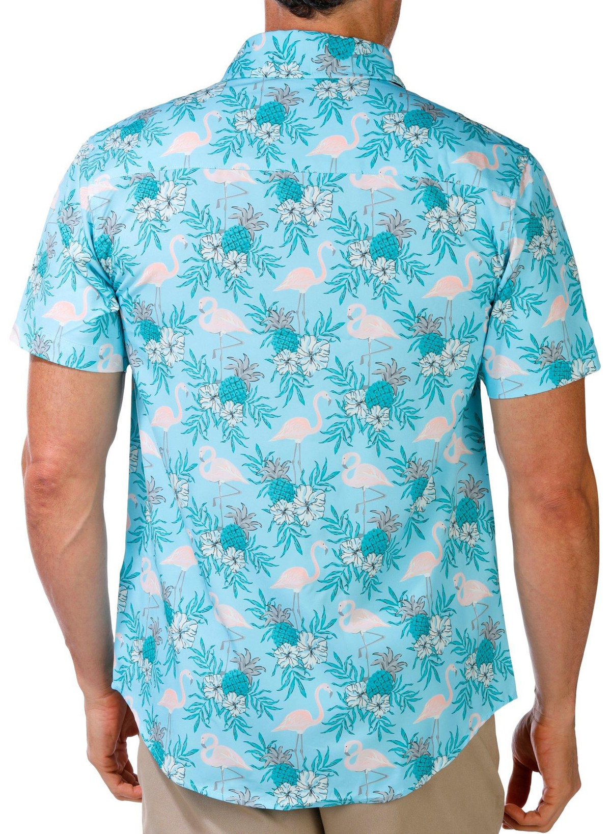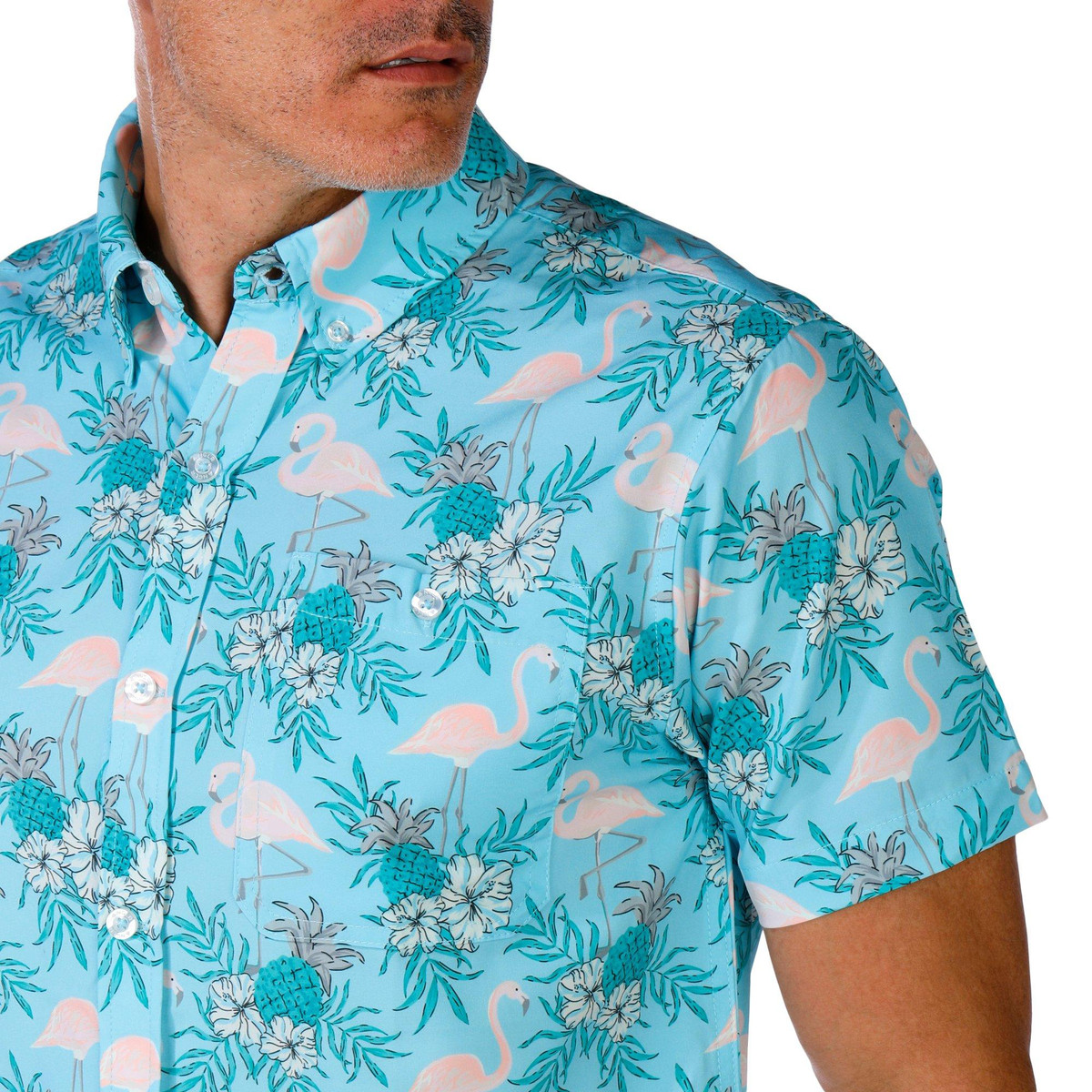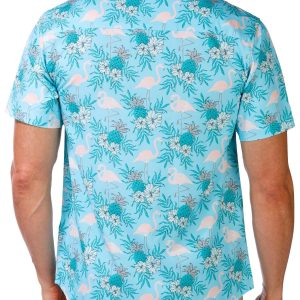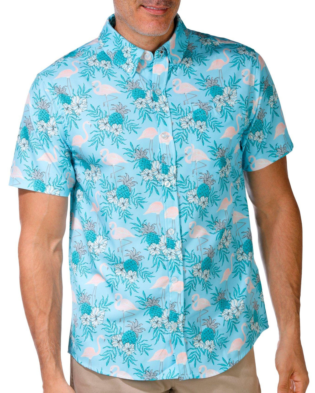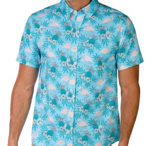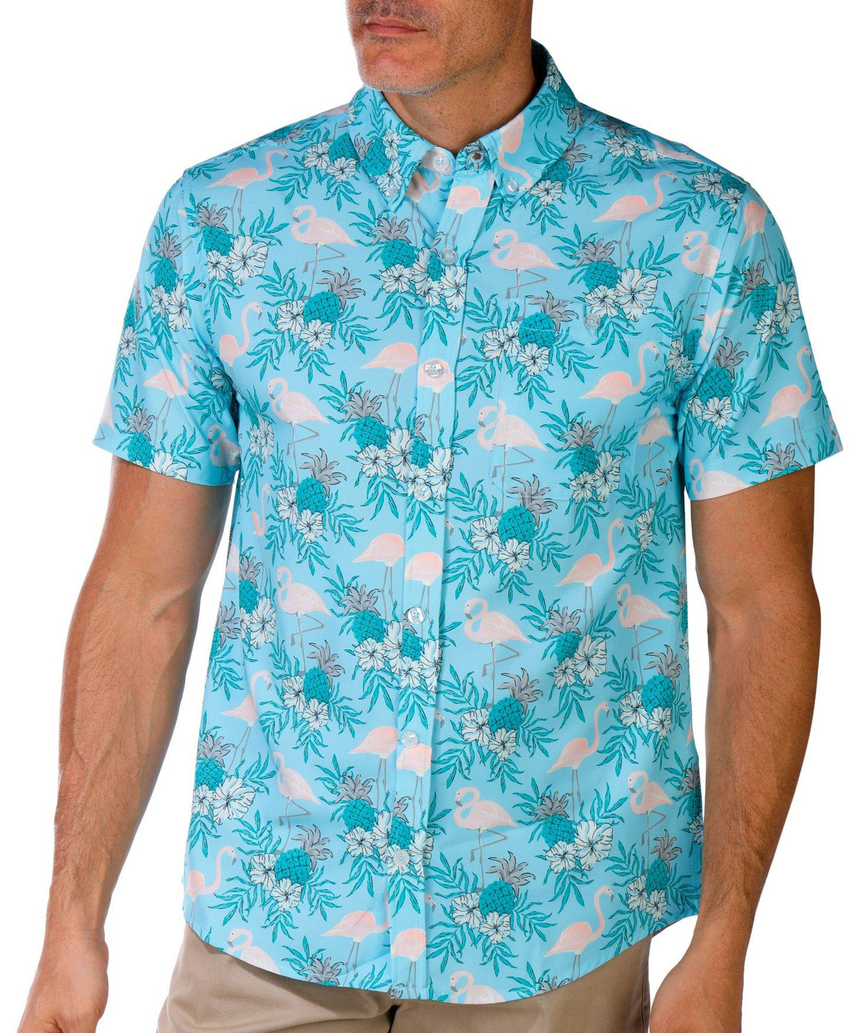 Explore in style with the Men’s Short Sleeve Floral Flamingo Button Down Shirt. Featuring a flamingo and pineapple graphic print, button-down front, and chest slip pocket, it is crafted from breathable, stretchy fabric with built-in sun protection. Fabrication 90% polyester, 10% spandex