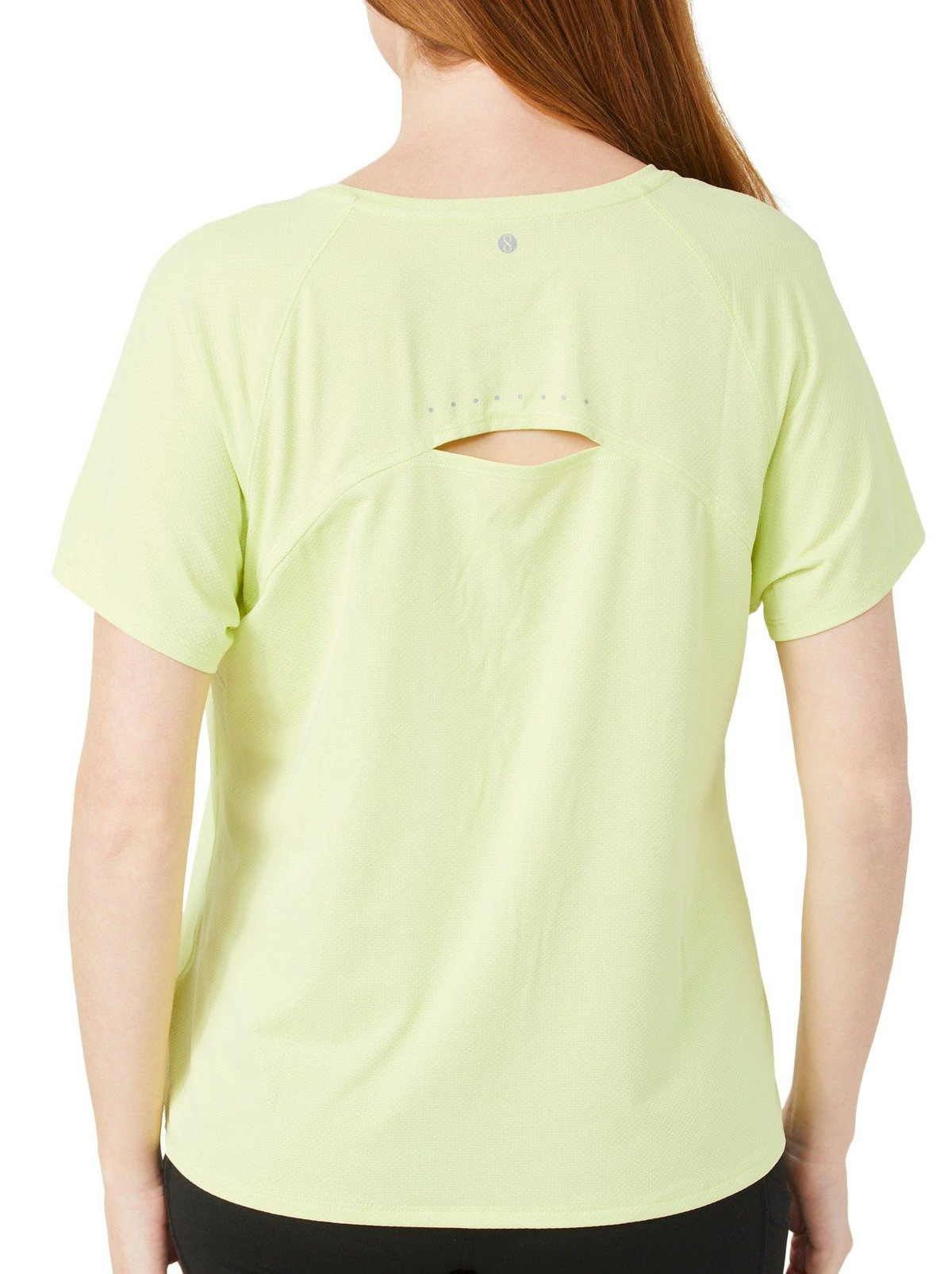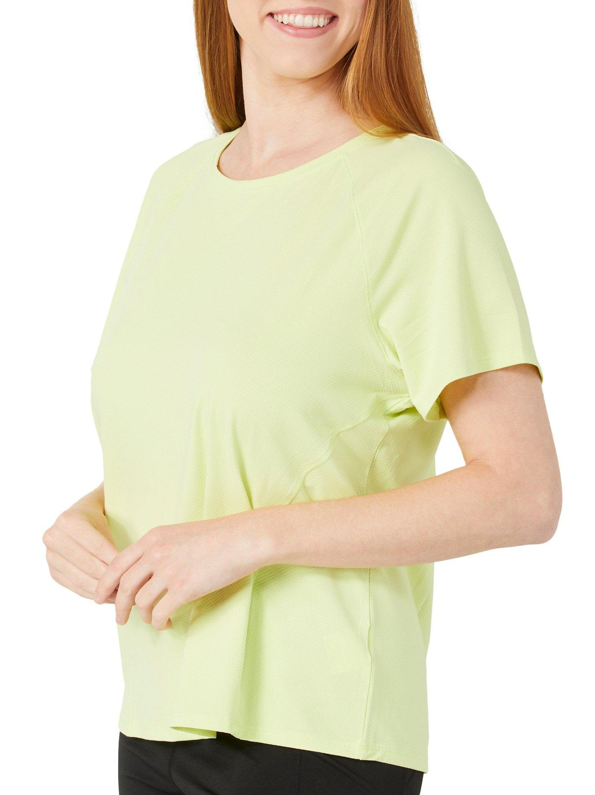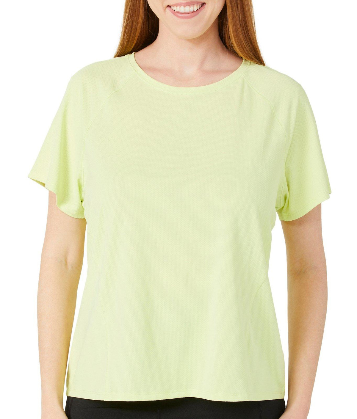 Our Womens Active Performance Tee delivers comfort and function with a solid color and classic crew neckline. A back keyhole enhances breathability while the sweat defying fabric keeps you dry. Lightweight with performance stretch, it moves with you through every workout or casual day. Fabrication 83% polyester, 17% spandex.