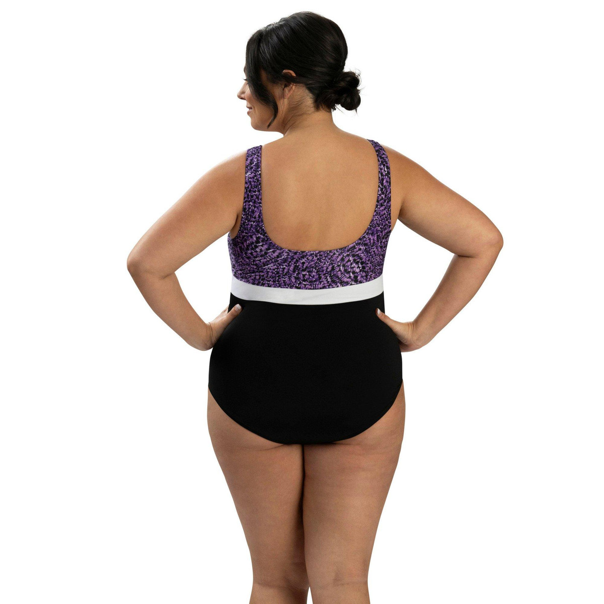 Dive into performance and style with this sleek color block swimsuit. Made from 100% polyester, it resists chlorine and pilling for long-lasting wear. A built-in shelf bra with sewn-in cups offers all-day support, while the scoop back ensures freedom of movement. Designed for a snug, athletic fit, its perfect for powering through training sessions or enjoying a day at the pool.