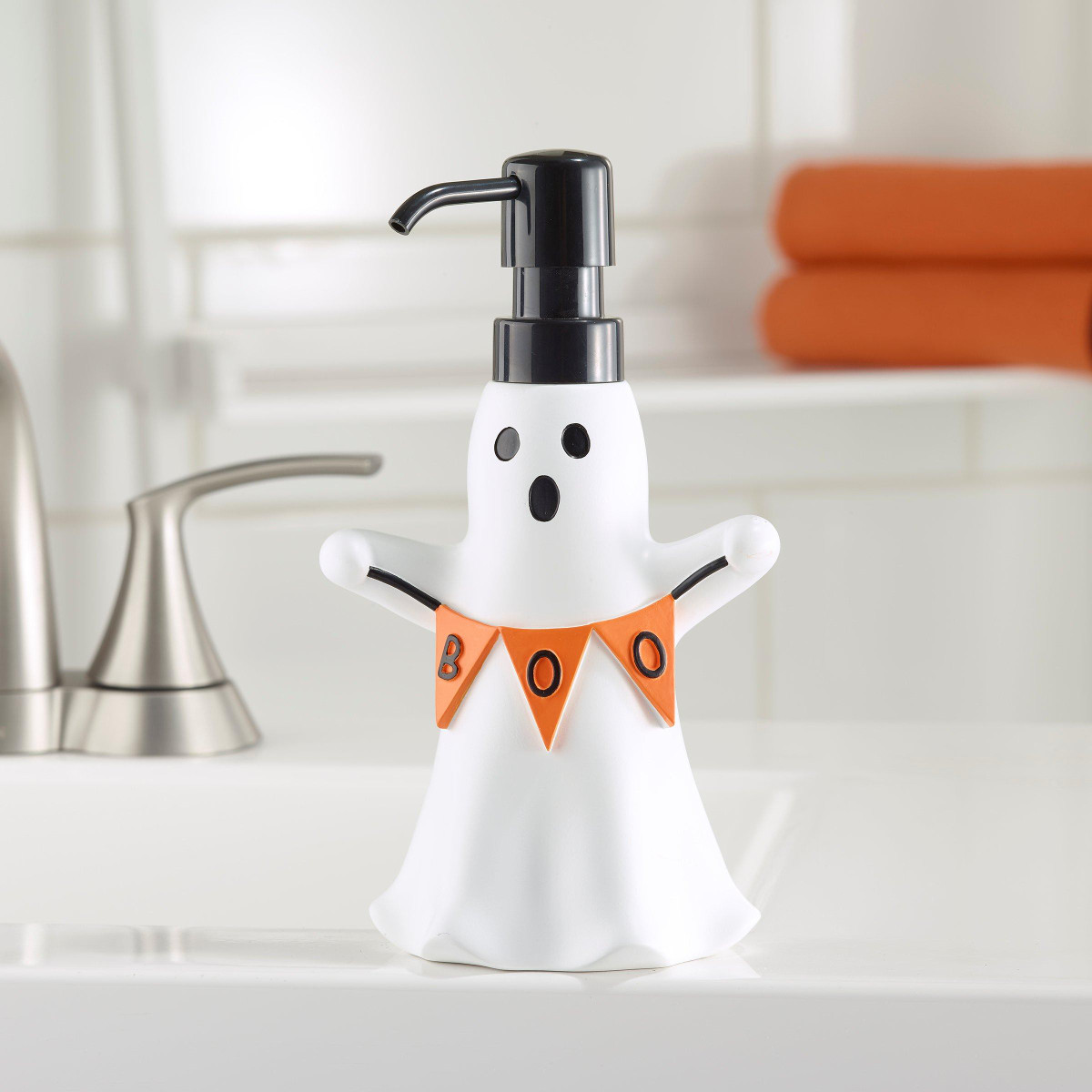 Add spooky charm to your space with the Avanti Ghost Boo Dispenser. This figural white ghost holds an orange BOO banner and features a matte black pump. Crafted from durable, hand-painted resin for long-lasting use, its perfect for lotion, soap, or sanitizer in the kitchen, bathroom, or office. Measures 4.70 in. x 3.00 in. x 7.96 in.