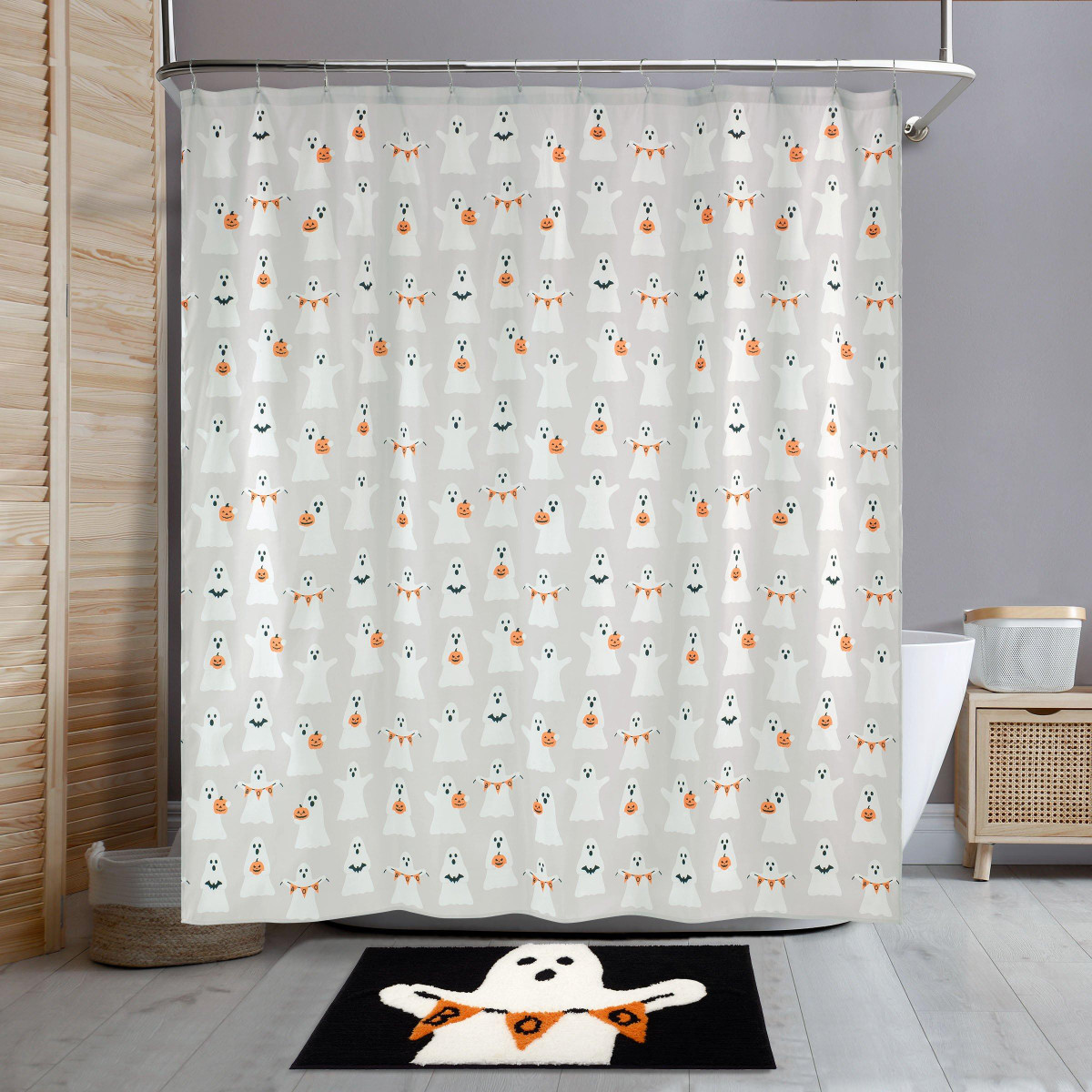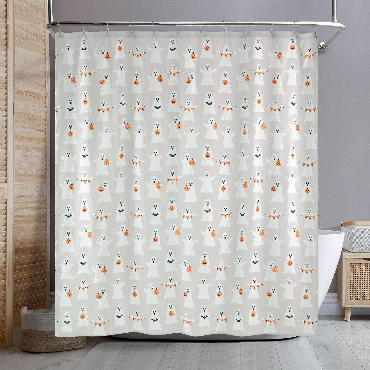 Add Halloween spirit to your bathroom with the Avanti Ghost Boo Shower Curtain. Featuring rows of playful white ghosts holding pumpkins, bats, and banners on a taupe background, this curtain brings festive fun to your décor. Printed on 100% polyester for vibrant color and easy care. Liner not included. Measures 72 in. x 72 in.