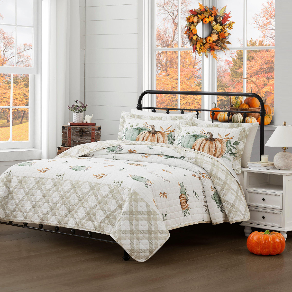 The Avanti Grateful Patch Quilt Set features a beautiful harvest scene with pumpkins and leaves, and a linen and white plaid border on an ivory background. Printed on and filled with 100% polyester with a box-stitch quilting pattern. 100% polyester.