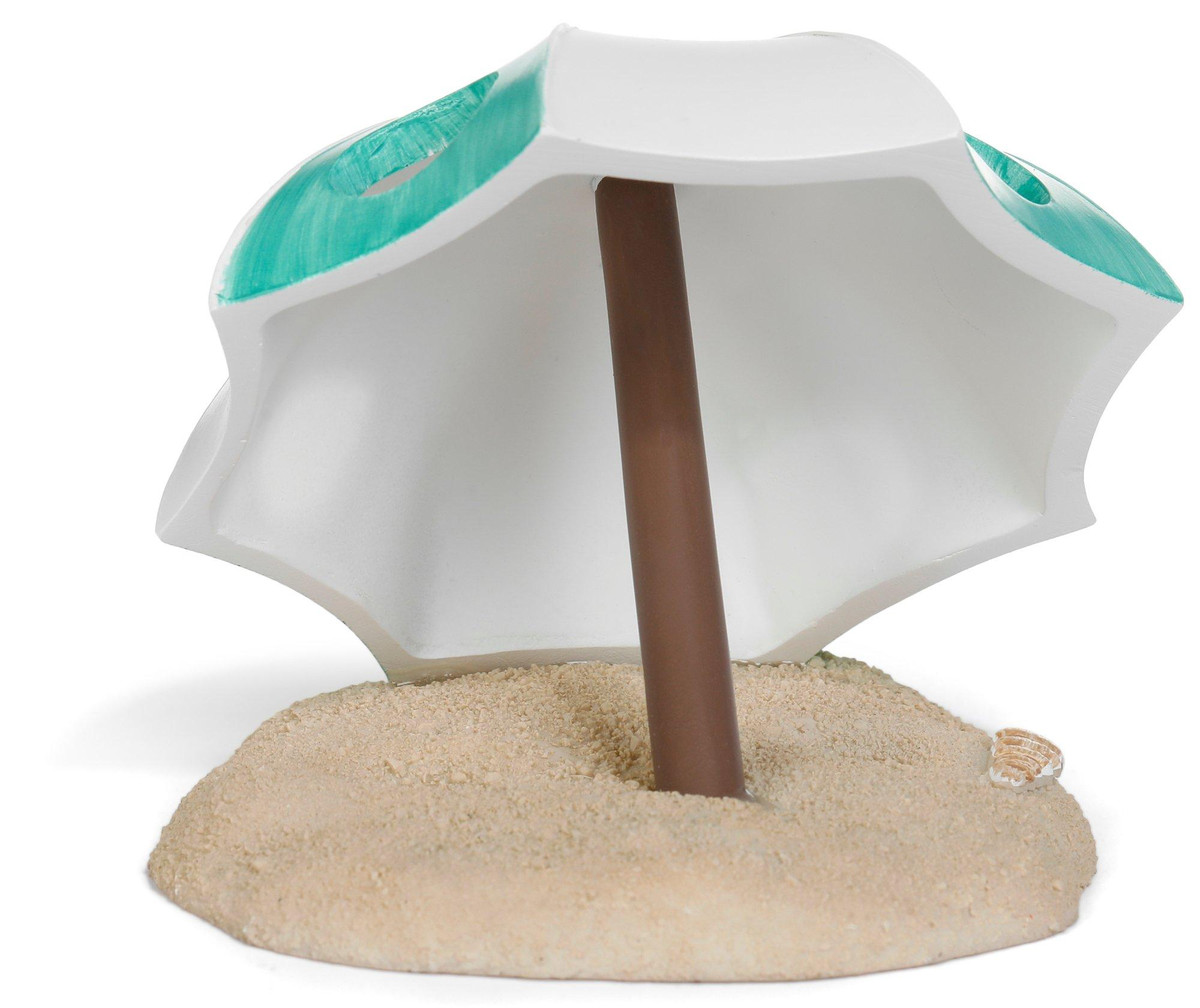 The Avanti Beach Mode Collection Toothbrush Holder adds a coastal touch with its green and white umbrella set in a sand base, featuring pink flip-flops and a fan shell. Crafted from durable, hand-painted resin, it holds up to four toothbrushes while complementing beach-inspired décor. Complete the look with matching accessories. You can find more details Measures 4.25 in. L x 4.25 in. W x 5.0 in. H