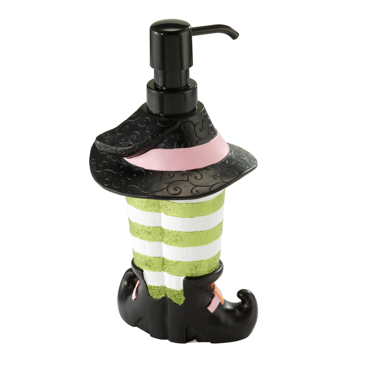 Bring spooky fun to your space with the Avanti Halloween Witch Feet Dispenser. Featuring green and white striped leggings, black shoes, and a witchs hat topper, this hand-painted resin design is both durable and eye-catching. Finished with a matte black pump, its perfect for dispensing lotion, soap, or sanitizer in any festive kitchen, bathroom, or office. Measures 4.53 in. x 4.33 in. x 9.45 in.