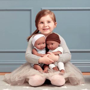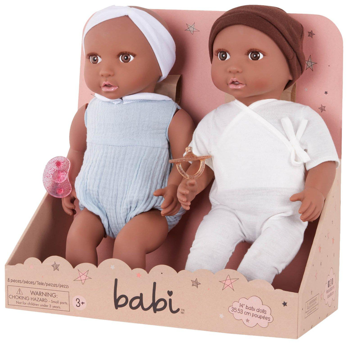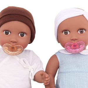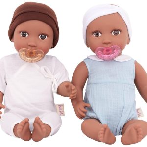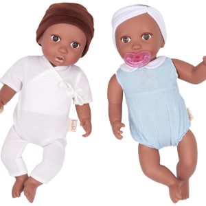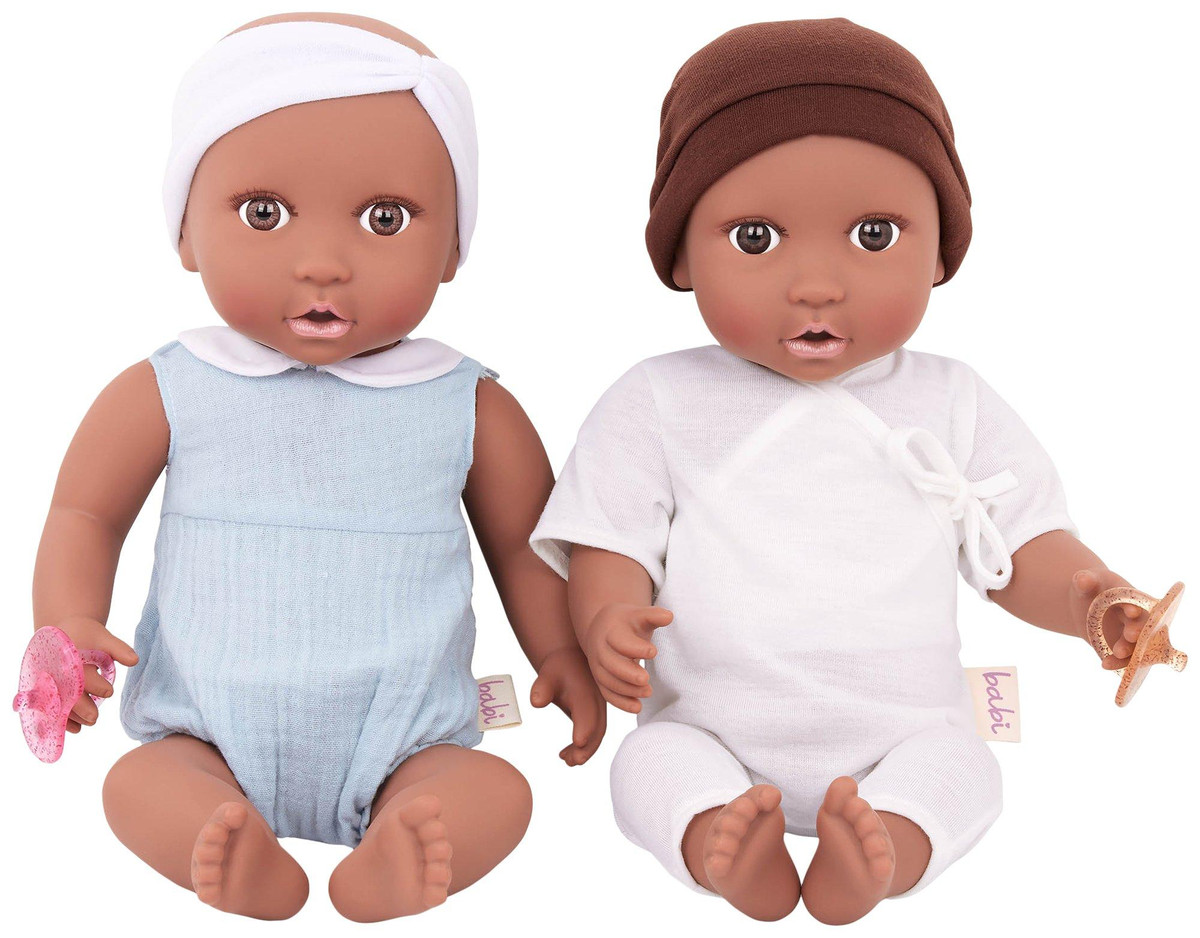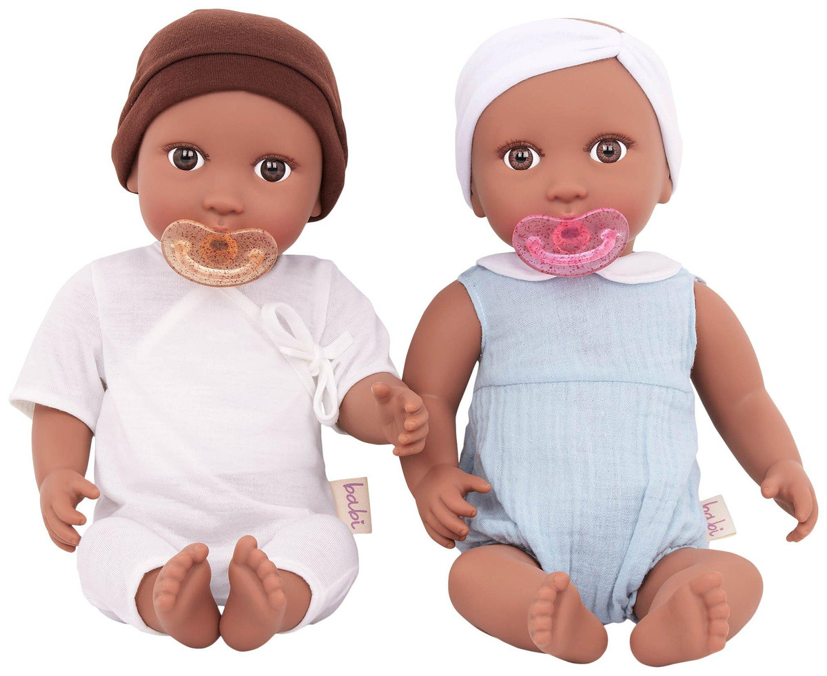 Nurturing play by Babi by Battat inspires compassion, kindness, and nurturing qualities the more children play and care for their babi dolls. These two dolls feature fixed-open, bright brown eyes, soft eyelashes, realistic face, hands, and feet, and huggable soft body to cuddle. Age: ages 3+ (small parts); perfect height for small hands, easy to clean, and durable for everyday play. Includes: babis are nestled in a lovely outfit with a matching pink headband and a removable pacifier accessory.