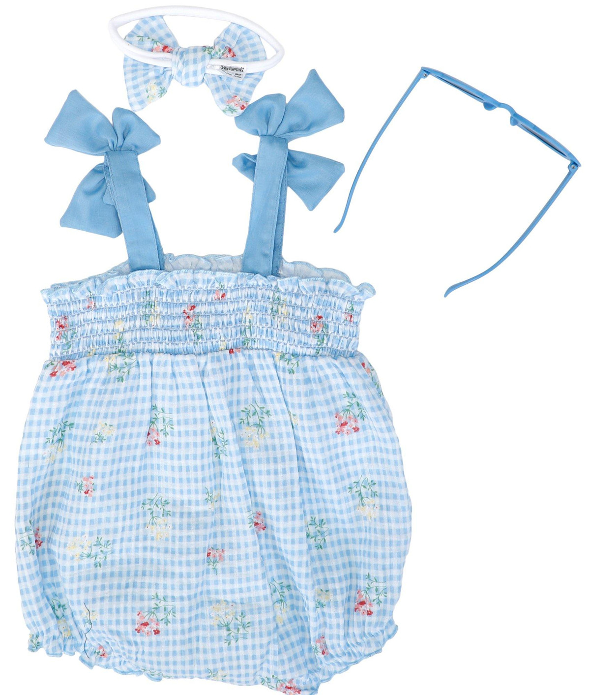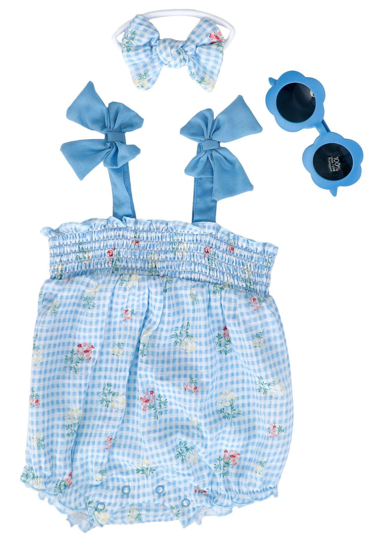 Dress your little one in adorable style with our Baby Girls 3 Pc Romper Set. Made from soft cotton, this set includes a sleeveless romper featuring a cute gingham print, floral-shaped sunglasses, and a matching bow.