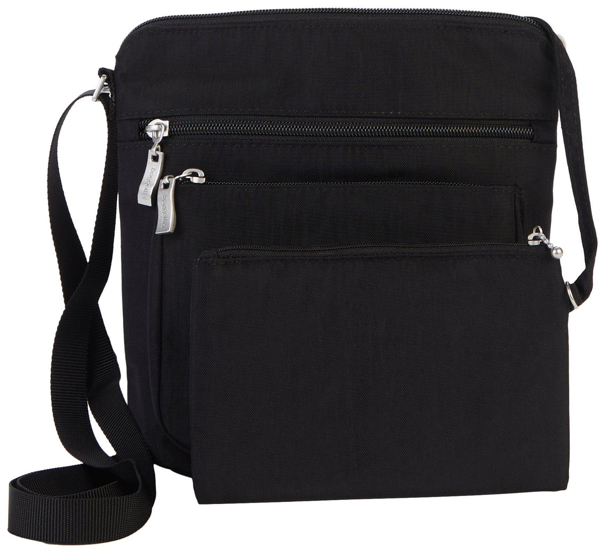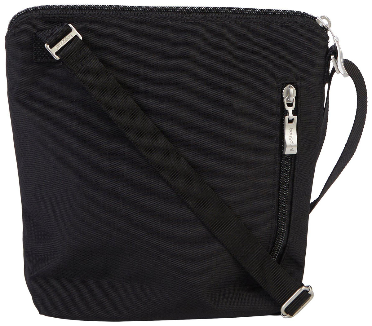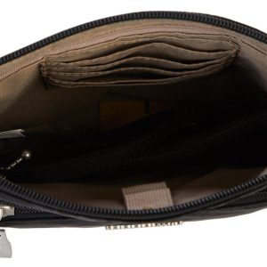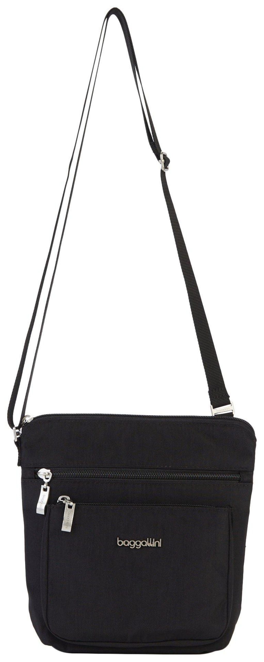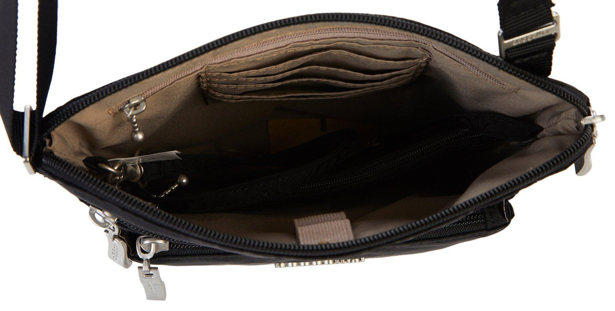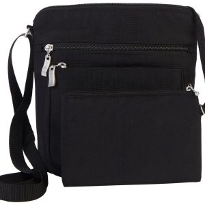 Crossbody made from water resistant fabric to keep your items safe in any weather. Features four zippered compartments for easy organization, adjustable straps for comfort, and an interior zippered wallet. Includes a card holder with RFID protection to guard against digital theft. Measures 9 in x 8 in.