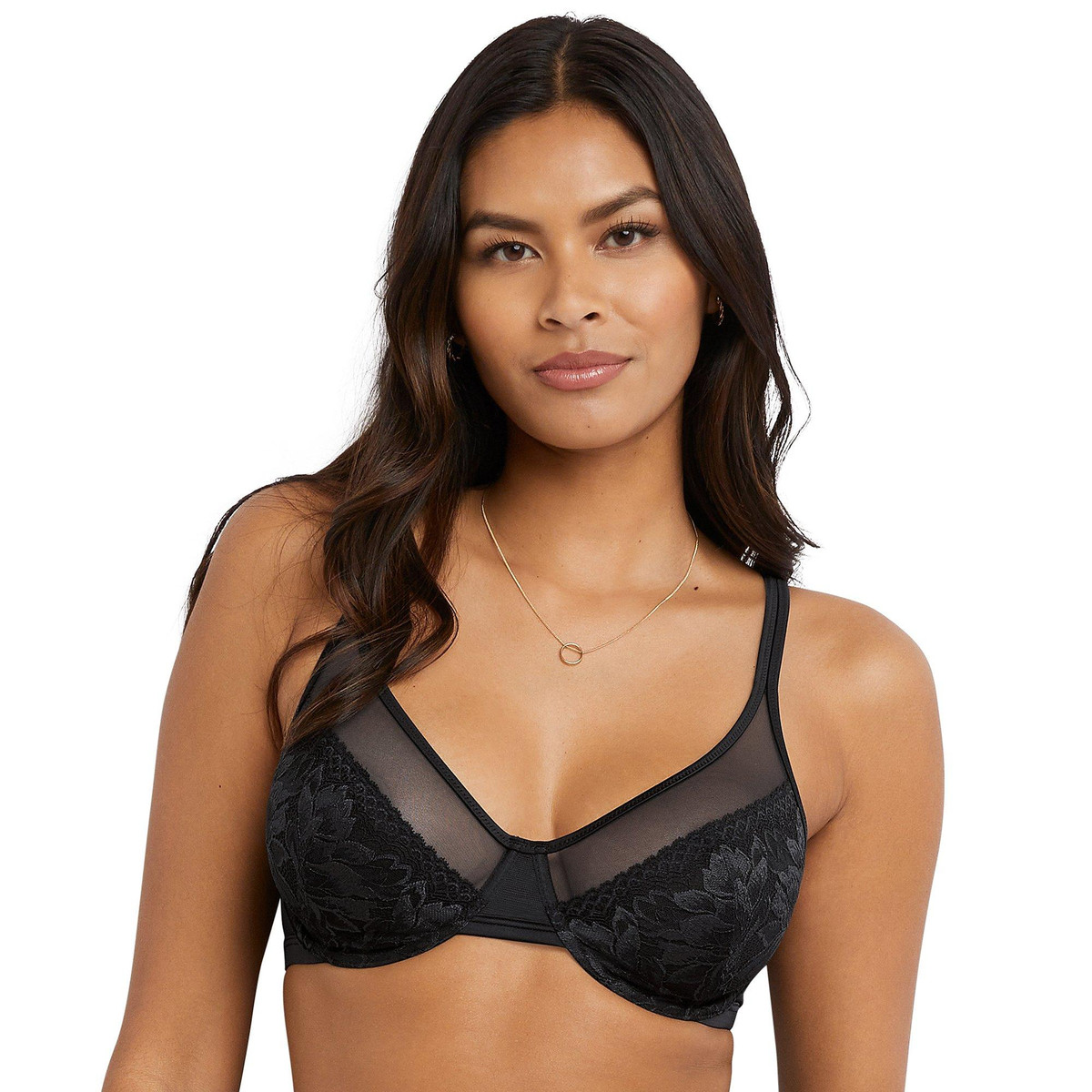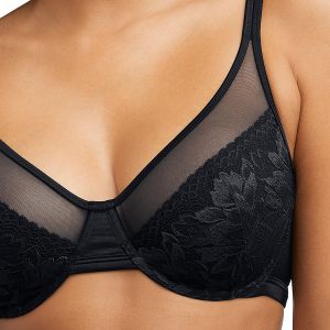This Minimizer Underwire Bra features a solid color design on a knit fabrication, lace full coverage stretch cups, breathable power mesh lining for support, and adjustable convertible straps. Minimizer styling minimizes and shapes up to 1.5 inches for a smooth silhouette. Fabrication 80% nylon, 20% spandex. Style DF3386.