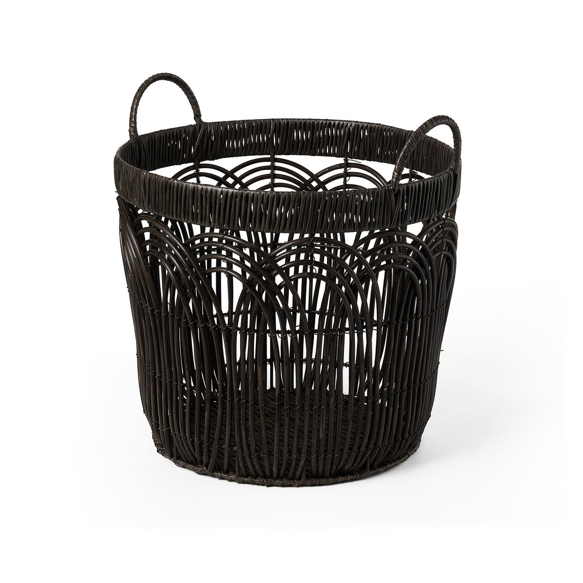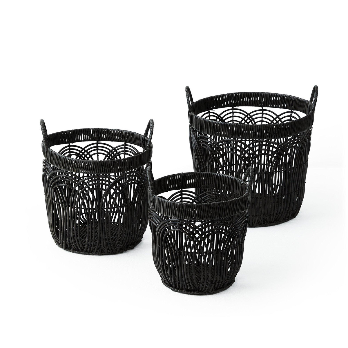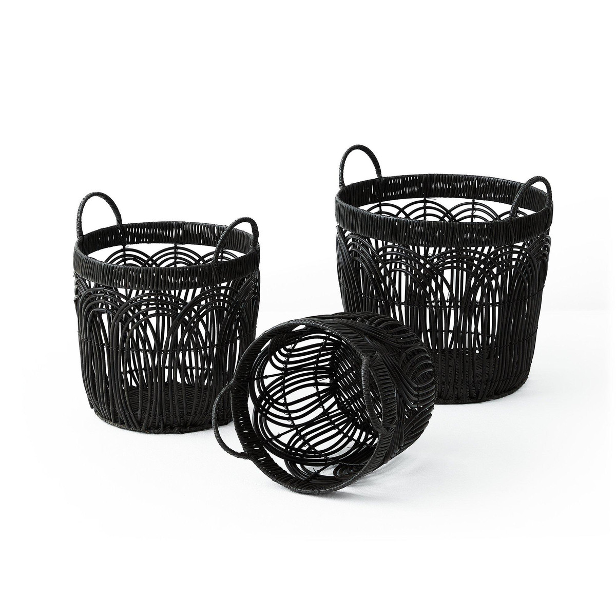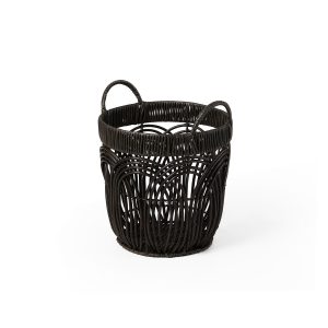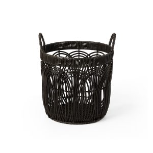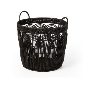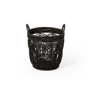 This set of three Round Faux Wicker Storage seamlessly blends form and function to elevate your décor. The durable build ensures longevity, while the sleek black finish complements any modern, boho, or minimalist space. Large- 14.2 in. x 14.2 in. x 12.6 in., Medium – 12.2 in. x 12.2 in. x 11.4 in., Small – 10.2 in. x 10.2 in. x 10.2 in.