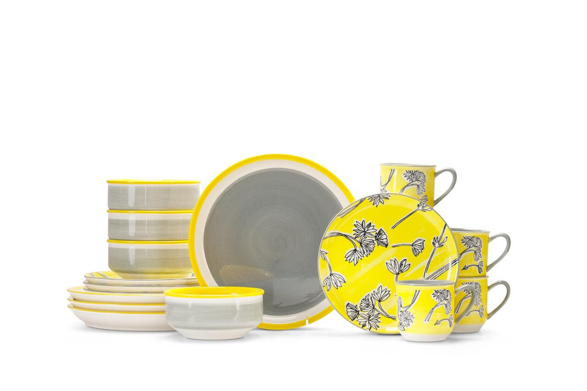 Make a splash with this bright and cheerful floral dinnerware set. This set plays with pattern and color, merging warm yellow florals with sophisticated and soothing greys. This dinnerware is a conversation piece that will illuminate any table.