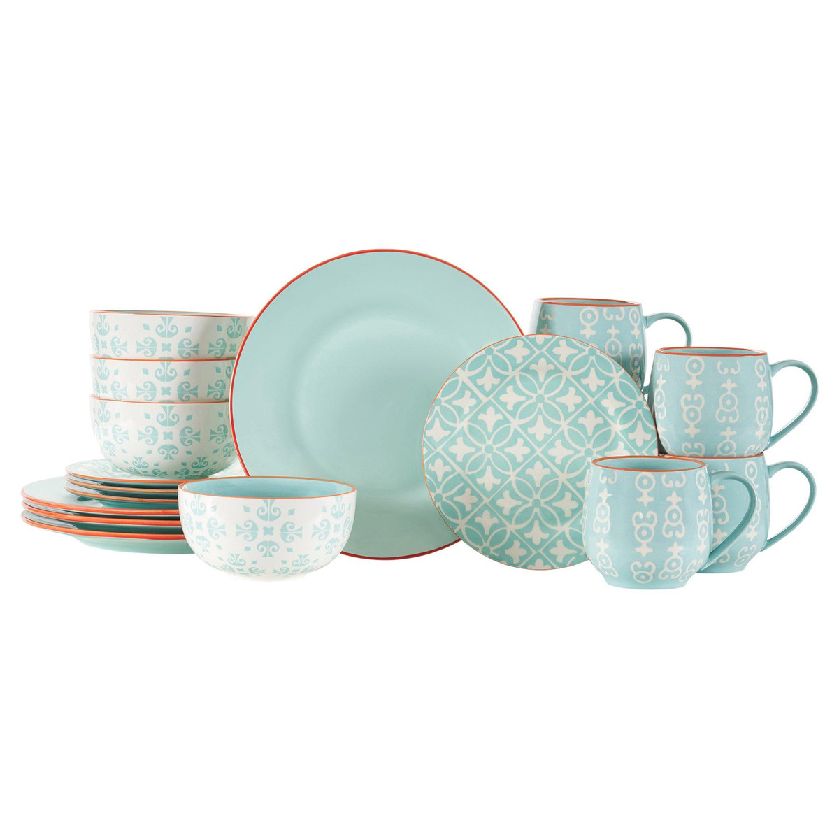 Malaga plays with pattern and solid pieces to create a soft and layered feel. Three separate geometric patterns adorn this set, along with a solid blue dinner plate to finish out this stunning look. This dining sets playful designs will make a beautiful bold statement on any table.